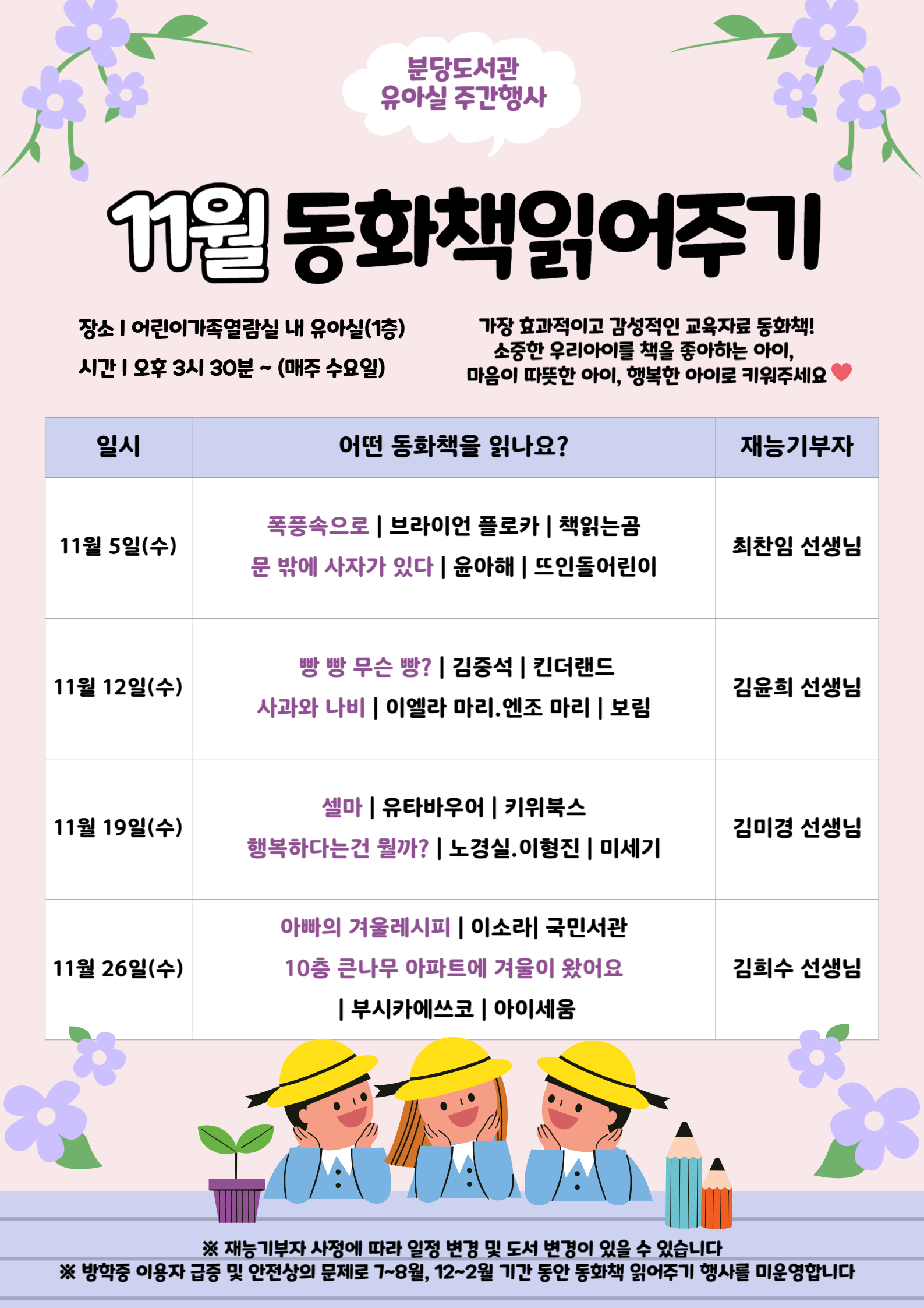 문의 031-729-4669 ※ 재능기부자 사정에 따라 일정 변경 및 도서 변경이 있을 수 있습니다. ※ 방학중 이용자 급증 및 안전상의 문제로 7~8월, 12~2월 기간 동안 동화책 읽어주기 행사를 미운영합니다. |