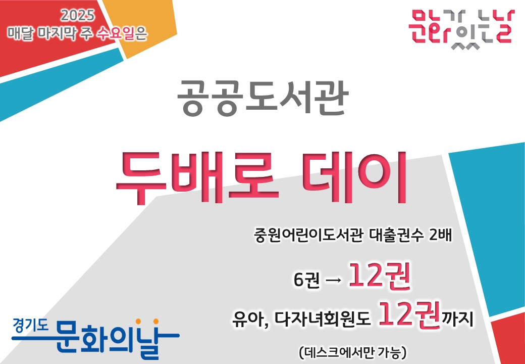 ![]() • 행사명 : < 두배로 데이 > • 일 시 : 2025년 11월 26일(수) 9 ~ 18시 - 운영시간 내 데스크에서만 가능합니다.(무인도서대출기에서는 불가) • 장 소 : 꼬마책동산(1층), 어린이책동산(2층) • 내 용 : 도서 대출권수 2배로 확대 <6권→12권> - 유아, 다자녀 등의 이용자도 12권까지만 대출가능합니다. - DVD는 기존과 동일하게 중학생이상 2점까지만 대출가능합니다. • 문 의 : 꼬마책동산 729-4365, 어린이책동산 729-4364 |