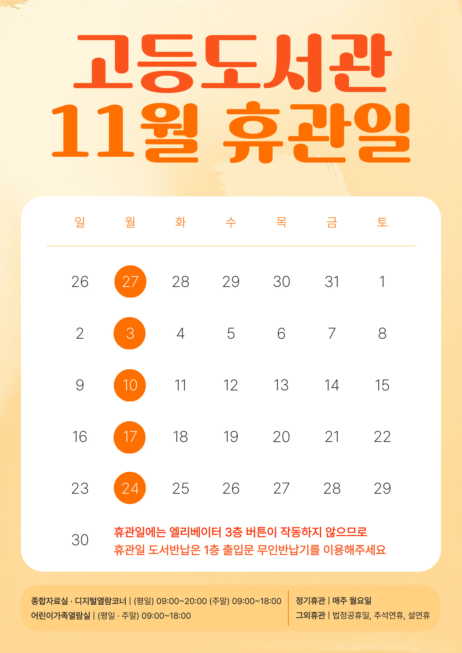 ![]() 고등도서관 11월 휴관일 3일, 10일, 17일, 24일 ※ 휴관일에는 엘리베이터 3층 버튼이 작동하지 않으므로 휴관일 도서반납은 1층 출입문 무인반납기를 이용해 주세요 ※ 휴관일: 매주 월요일 및 법정공휴일(일요일 제외), 설연휴, 추석연휴 ※ 종합자료실/디지털열람코너: (평일) 9~20시 (주말) 9~18시 ※ 어린이가족열람실: (평일/주말) 9~18시 |