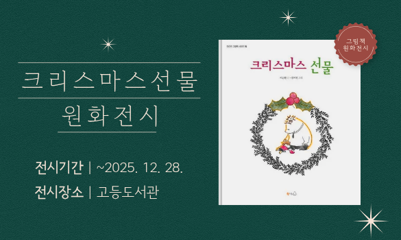 장소 : 고등도서관 원화전시코너 ※ 글자가 없는, 원화아트프린팅(원화복제본) 전시입니다. ✨ 다음 원화전시 반짝예고 ✨ 다음에는 어떤 원화전시가 기다리고 있을까요? 👀 힌트는 땅콩🥜 + 호텔🏨… 혹시 감이 오시나요? 12월 30일(화), 고등도서관에서 만나요!