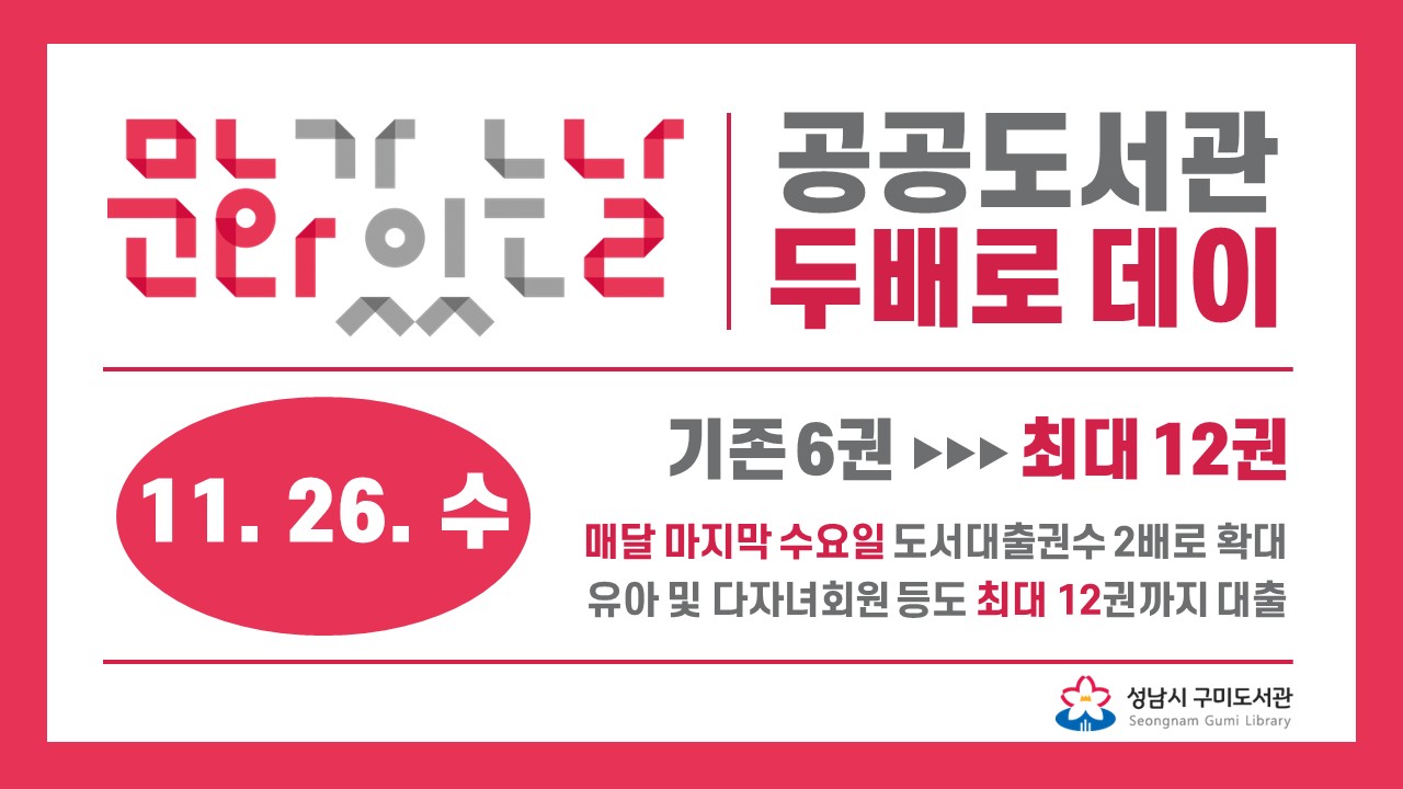 ![]() 11월 26일 수요일, 경기도 문화의 날 '문화가 있는 날' ○ 매달 마지막 수요일, 도서관과 함께하는 공공도서관 두배로 데이 - 구미도서관 문헌정보실, 어린이실 도서대출권수 2배 (DVD 제외) - 당일 하루만 기존 6권에서 최대12권까지 대출권수 확대 - 유아 및 다자녀회원도 12권까지만 대출 가능 |