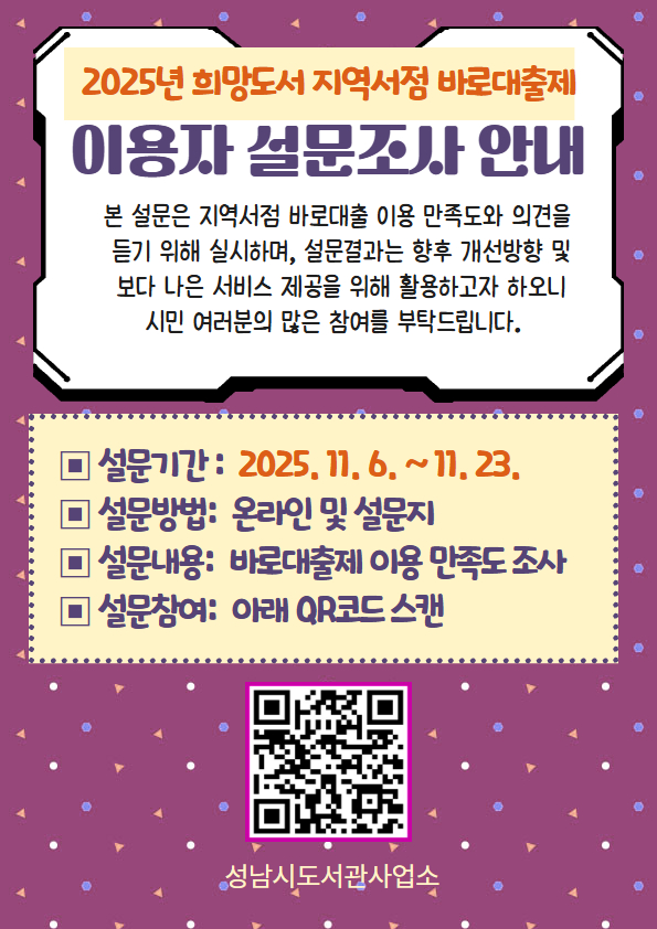 | 제목 | 2025년 희망도서 지역서점 바로대출제 이용자 설문조사 참여 안내 |