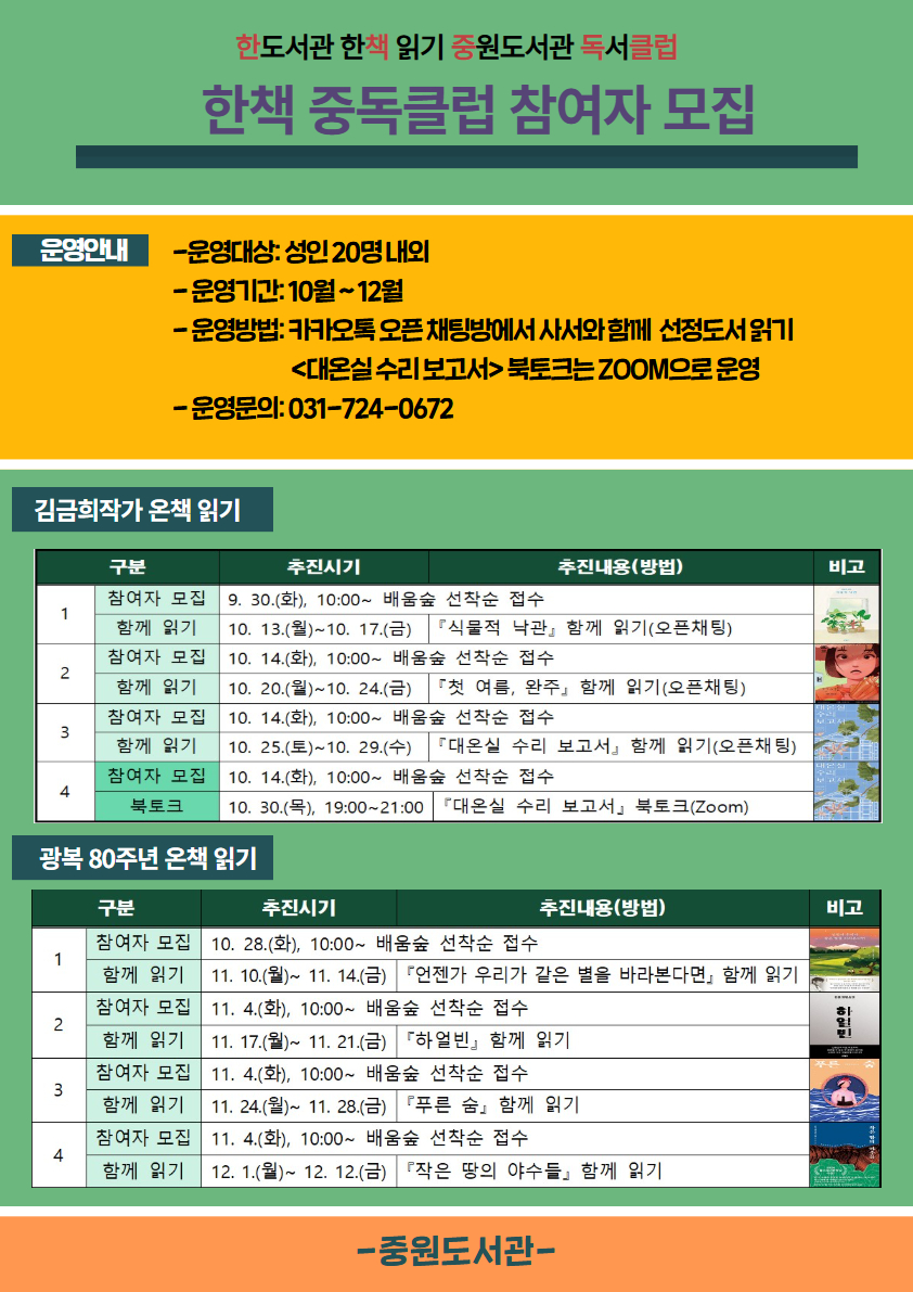 한책 중독 클럽(한도서관 한책 읽기 중원도서관 독서클럽) 운영 - 운영대상: 성인 20명 내외 - 운영기간: 10월 ~ 12월 - 운영방법 - 카카오톡 오픈 채팅방에서 사서와 함께 선정도서 읽기 - <대온실 수리 보고서> 북토크는 ZOOM으로 운영 - 각 주차별로 함께 읽고 싶은 책 배움숲에서 선착순 접수 - 김금희작가 온책 읽기와 광복 80주년 온책 읽기 4회 모두 참여시 기념품 증정(에코백+볼펜) **중복참여 가능** - 운영문의: 031-724-0672