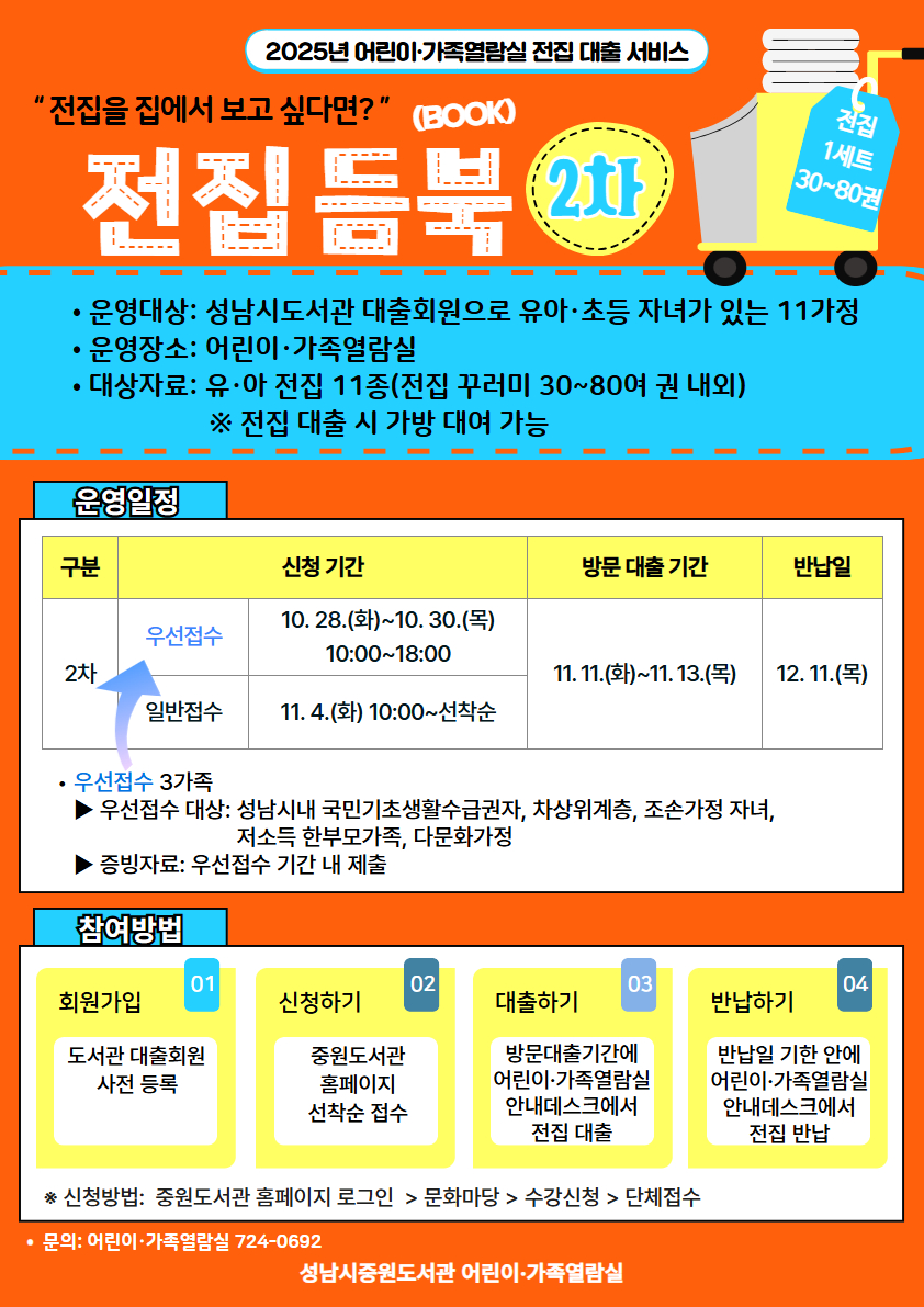 ![]() - 2025년 어린이·가족열람실 전집 대출 서비스 - 2차 「전집듬북(BOOK)」 운영 안내 □ 운영일정 - 신청기간 • 우선접수: 10. 28.(화)~10. 30.(목) 10:00~18:00 • 일반접수: 11. 4.(화) 10:00~선착순 - 방문 대출 기간: 11. 11.(화) 10:00~11. 13.(목) 17:00 - 반납일: 12. 11.(목) ※ 차시별 우선접수 3가족 이내 ▶ 우선접수 대상: 성남시내 국민기초생활수급권자, 차상위계층, 조손가정 자녀, 저소득 한부모가족, 다문화가정 ▶ 증빙자료: 우선접수 기간 내 제출 □ 운영대상: 성남시도서관 대출회원으로 유아·초등 자녀가 있는 가정 □ 운영장소: 중원도서관 어린이·가족열람실 □ 대상자료: 유아·초등 저학년 전집 11세트(1세트 30~80권) (※ 전집 선정도서 목록은 첨부파일 확인!) □ 운영내용 ❍ 책 꾸러미 운영 방법 ▶ (1단계) 회원가입: 도서관 대출회원 사전 등록 ▶ (2단계) 신청하기: 중원도서관 홈페이지 선착순 접수(홈페이지 로그인>문화마당>수강신청>단체접수) ▶ (3단계) 대출하기: 방문 대출 기간에 어린이·가족열람실 안내데스크에서 전집 대출 ▶ (4단계) 반납하기: 반납일 기한 안에 어린이·가족열람실 안내데스크에서 전집 반납 ※ 전집 대출/반납은 어린이가족열람실 데스크에서만 가능 (※ 반납함 반납 및 상호대차 불가) ※ 무거운 전집 대출 시 가방 대여 가능 |