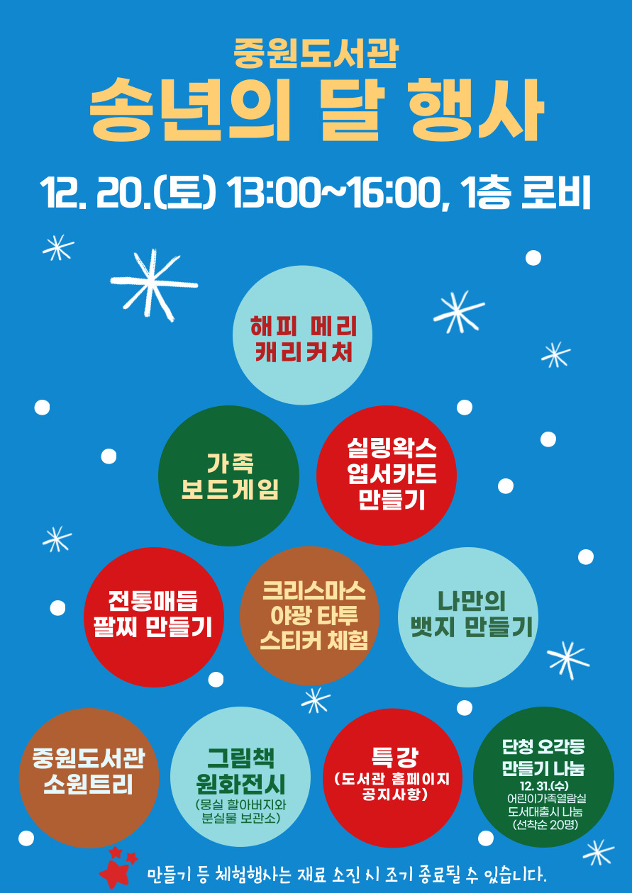 ![]() [2025년 송년의 달 행사] 일시: 2025. 12. 20.(토) 13:00~16:00 장소: 도서관 1층 로비 ○ 해피 메리 캐리커처 ○ 가족 보드게임 ○ 실링왁스 엽서카드 만들기 ○ 전통매듭 팔찌 만들기 ○ 크리스마스 야광 타투 스티커 체험 ○ 나만의 뱃지 만들기 ○ 중원도서관 소원트리 ○ 그림책 원화전시 ○ 단청 오각등 만들기 나눔 **12.31.(수) 어린이가족열람실 도서 대출시 단청 오각등 만들기 체험키트 나눔(선착순 20명)** |