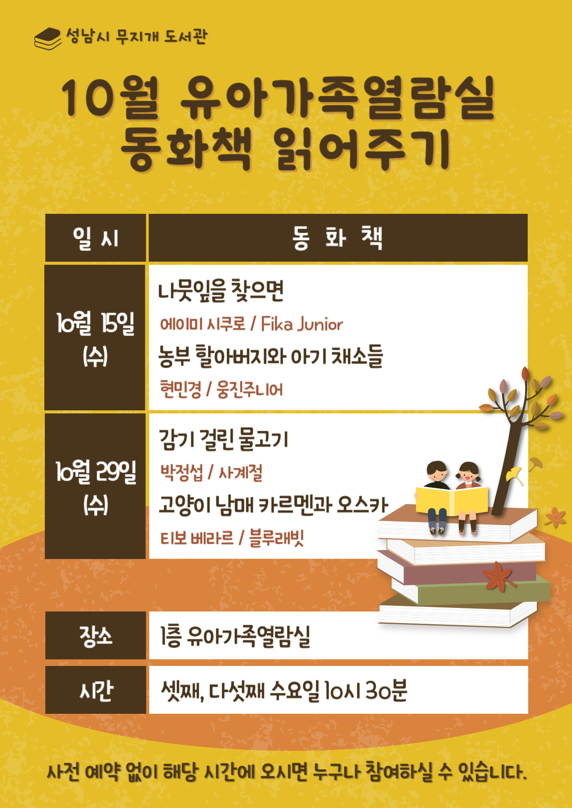 [2025년 10월 동화책 읽어주기 안내] 10.15.(수) 1. 나뭇잎을 찾으면 / 에이미 시쿠로 / Fika Junior 2. 농부할아버지와 아기채소들 / 현민경 / 웅진주니어 10.29.(수) 1. 감기 걸린 물고기 / 박정섭 / 사계절 2. 고양이 남매 카르멘과 오스카 / 티보 베라르 / 블루래빗