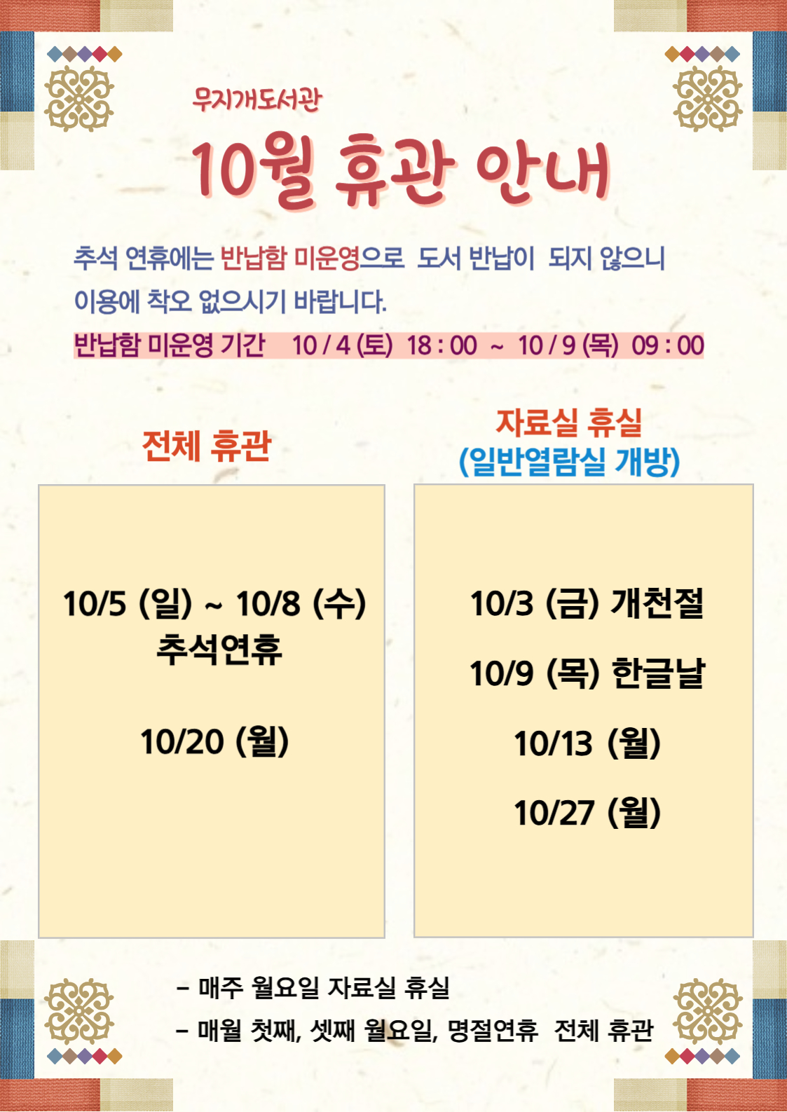 [ 2025년 10월 무지개도서관 휴관 안내 ] - 10. 03. (금): 자료실 휴실, 일반열람실 개방 (개천절) - 10. 05. (일) ~ 10. 08. (수): 전체휴관 (추석연휴-반납함미운영) - 10. 09. (목): 자료실 휴실, 일반열람실 개방 (한글날) - 10. 13. (월): 자료실 휴실, 일반열람실 개방 - 10. 20. (월): 전체휴관 - 10. 27. (월): 자료실 휴실, 일반열람실 개방