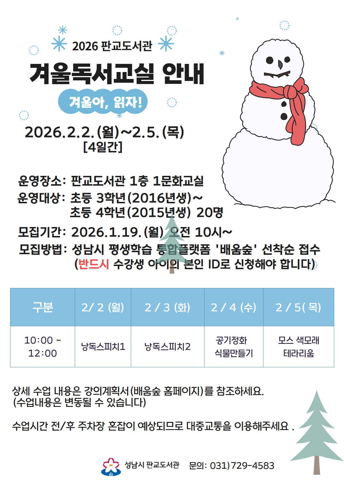 2026년 판교도서관 겨울독서교실 수강생 모집