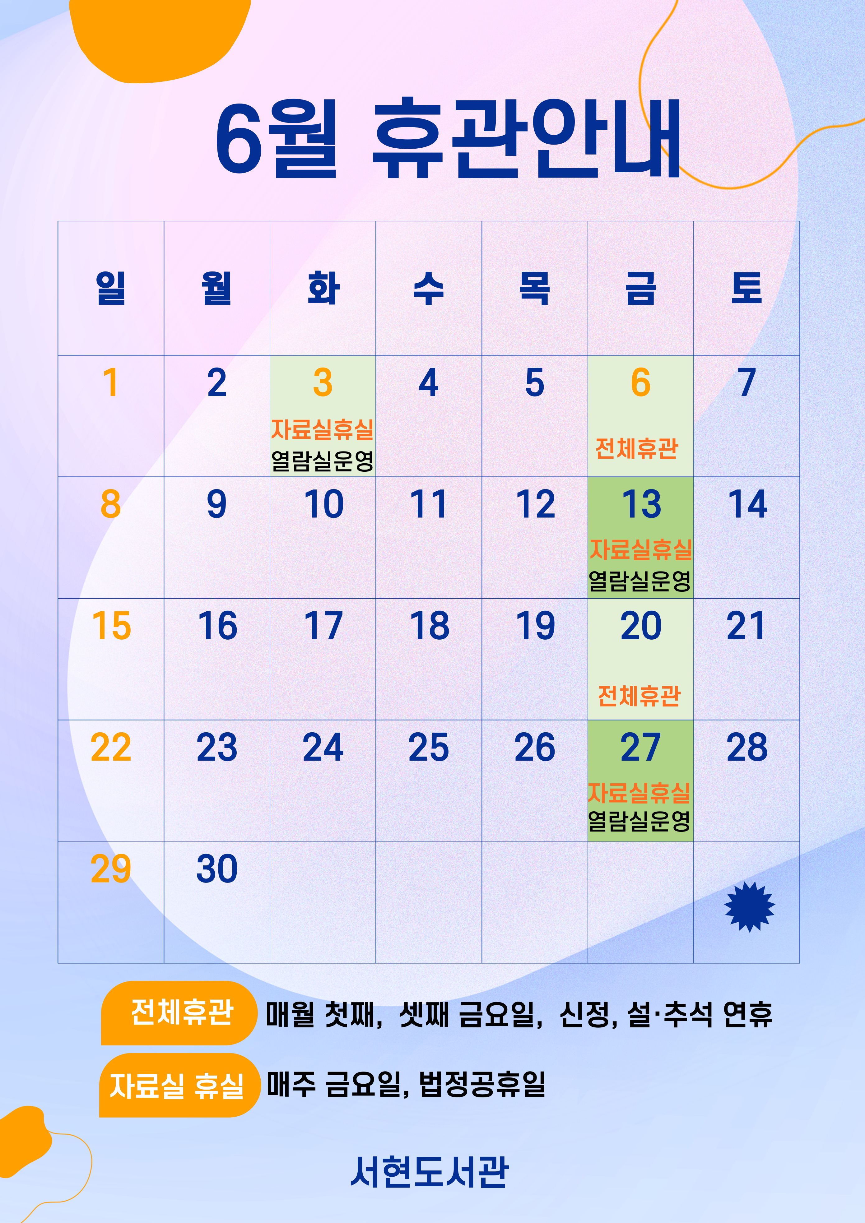 6/13(금) [둘째 금요일] 자료실 휴실, 일반열람실 운영