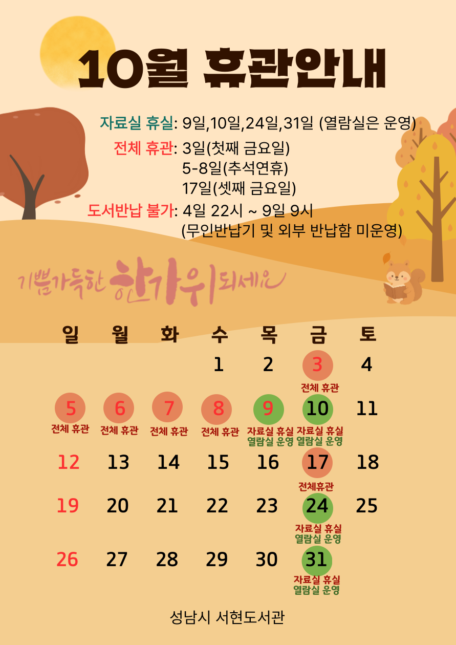 | 제목 | 서현도서관 2025년 10월 휴관안내 |