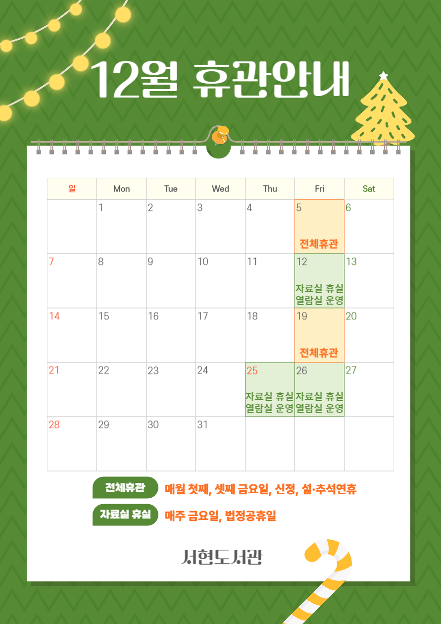12/25(목) [크리스마스] 자료실 휴실, 일반열람실 운영
