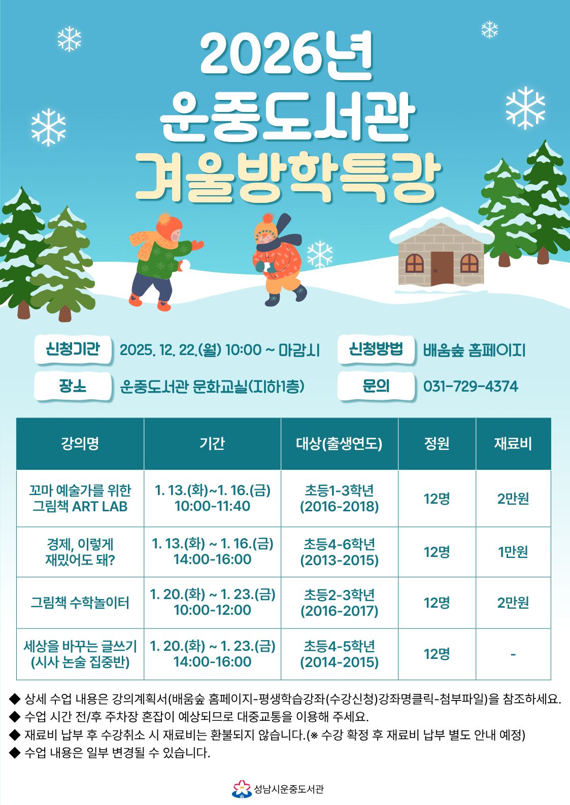 | 제목 | 2026년 운중도서관 겨울방학특강 수강생 모집 안내 |