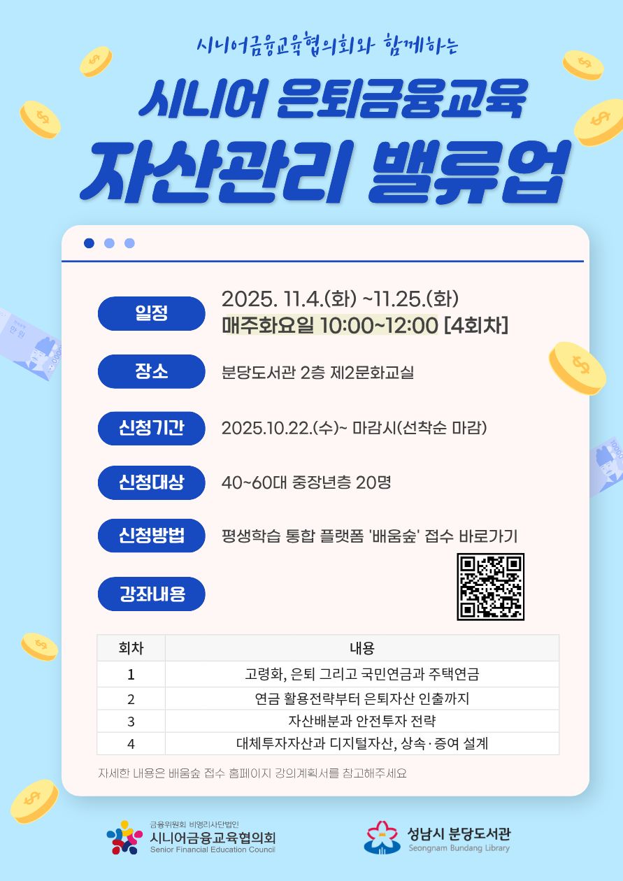 신청바로가기 □ 운영일시: 2025. 11. 4.(화) ~ 11. 25.(화) 10:00~12:00 [총4회] □ 장 소: 분당도서관 제2문화교실(2층) □ 대 상: 40-60대 중장년층 □ 교육내용: 은퇴자산 관리의 기초와 안정적인 투자전략, 은퇴자산 포트폴리오 형성, 대체투자의 이해 등 □ 교육방법: 시니어금융교육협의회 소속 전문강사를 통한 은퇴자산관리 이론교육 * 앞으로의 은퇴를 준비하고자 하는 분들에게 더욱 유익하고 실질적인 도움이 되는 강의임으로 40대 중장년층분들도 많은 관심 부탁드립니다.문의: 031-729-4669 |