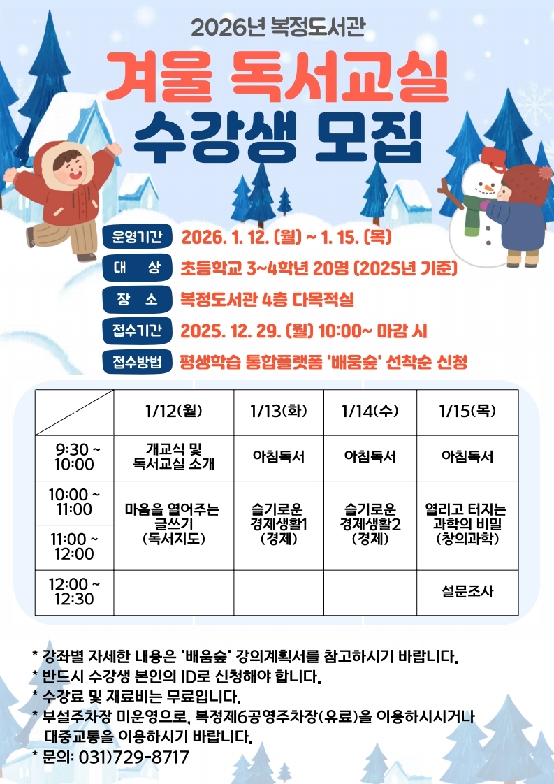 | 제목 | 2026년 복정도서관 겨울독서교실 수강생 모집 안내 |
