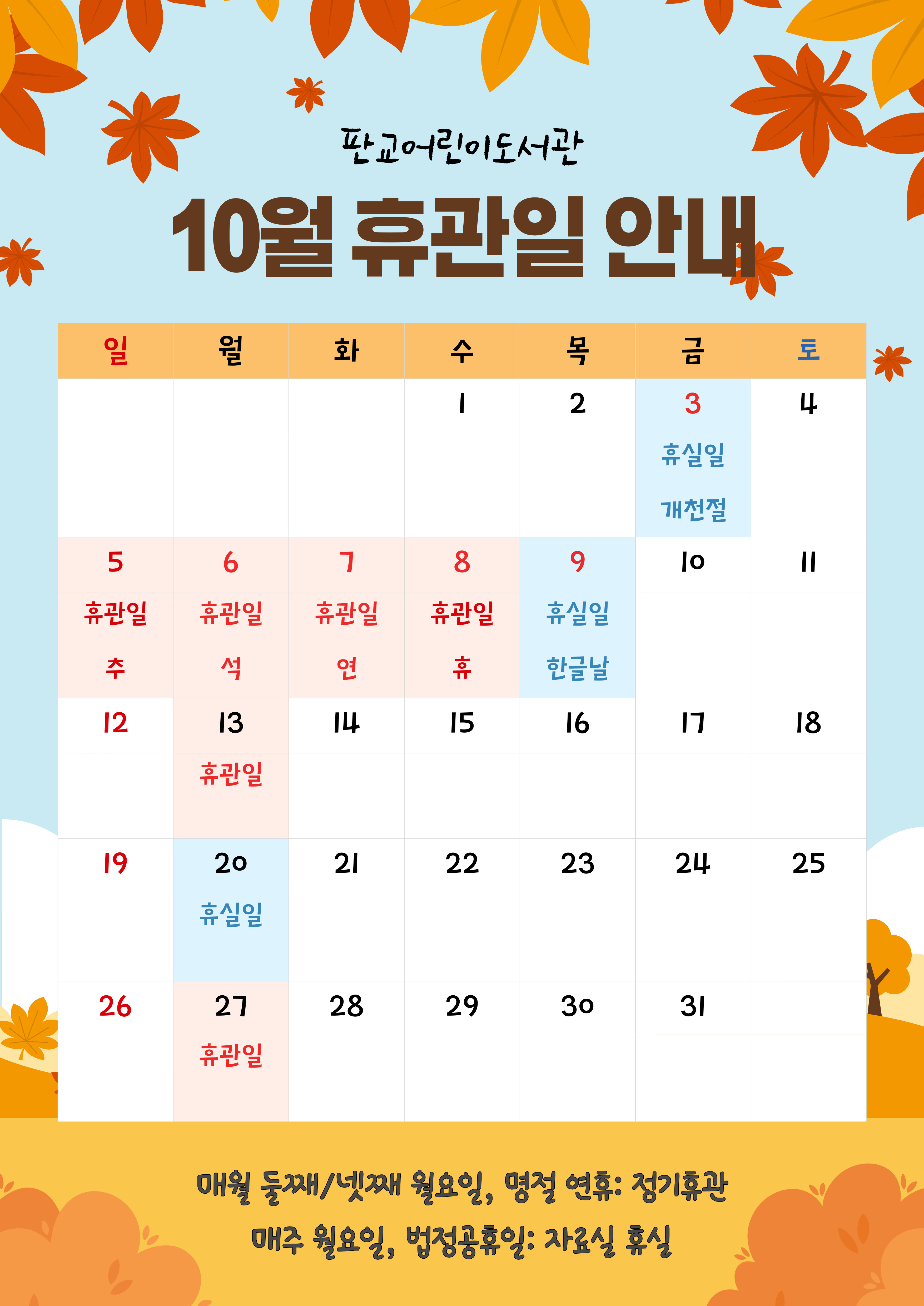![]() ※판교어린이도서관 2025년 10월 휴관일 안내※ 10월 3일(금) 개천절: 자료열람실(1관) 휴실 / 일반열람실(2관) 개방 10월 5일(일) ~ 10월 8일(수) 추석연휴: 전체(1~2관) 휴관 *10.4.(토) 18:00 ~ 10.9.(목) 09:00 추석 연휴 무인반납기 미운영(도서반납 불가) 10월 9일(목) 한글날: 자료열람실(1관) 휴실 / 일반열람실(2관) 개방 10월 13일(월): 전체(1~2관) 휴관 10월 20일(월): 자료열람실(1관) 휴실 / 일반열람실(2관) 개방 10월 27일(월): 전체(1~2관) 휴관 매주 월요일, 법정공휴일:자료실(유아열람실, 아동열람실, 문헌정보실) 휴실 둘째/넷째 월요일, 명절연휴: 정기 휴관 |