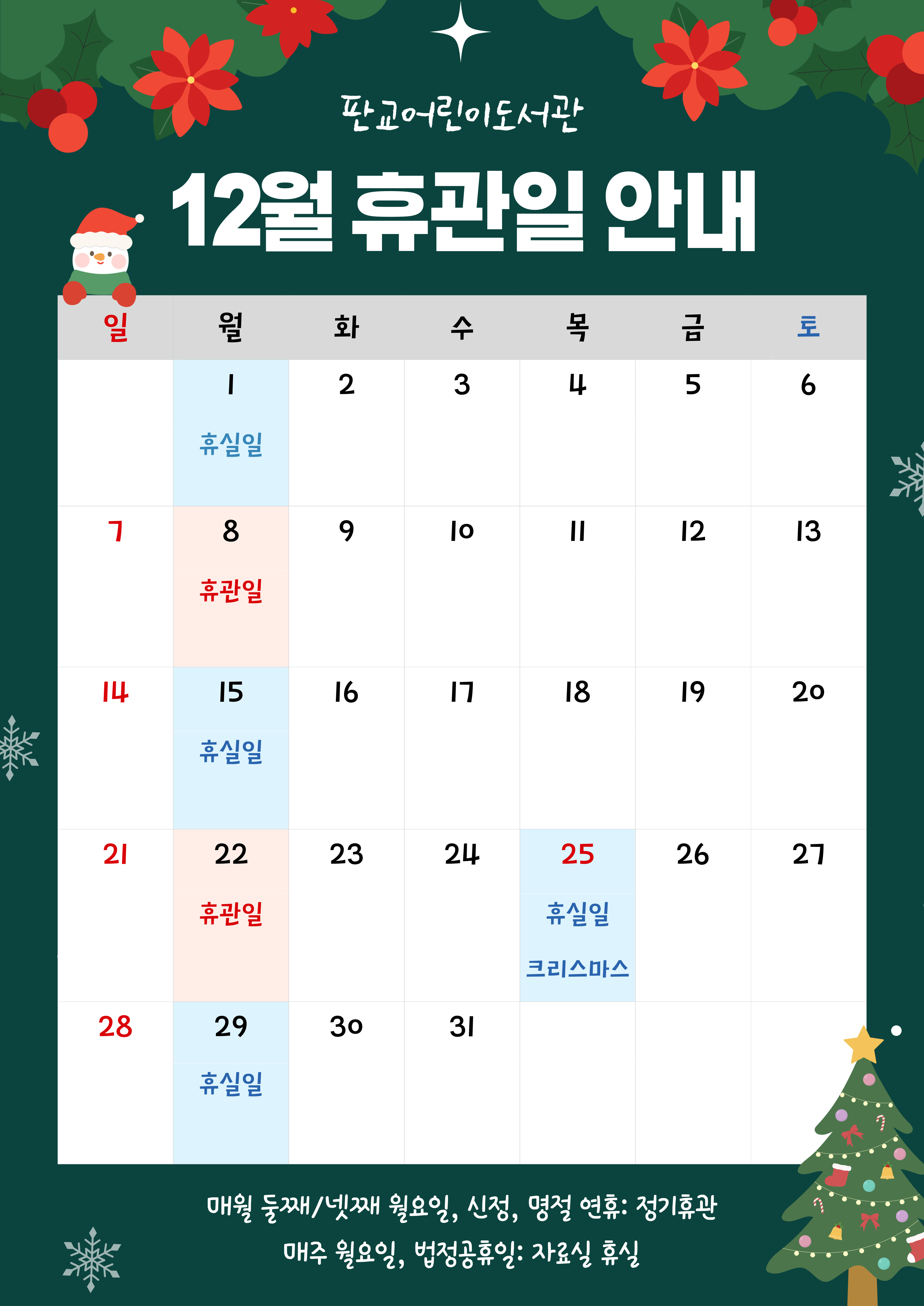 ![]() ※판교어린이도서관 2025년 12월 휴관일 안내※ 12월 1일(월): 자료열람실(1관) 휴실 / 일반열람실(2관) 개방 12월 8일(월): 전체(1~2관) 휴관 12월 15일(월): 자료열람실(1관) 휴실 / 일반열람실(2관) 개방 12월 22일(월): 전체(1~2관) 휴관 12월 25일(목) 크리스마스: 자료열람실(1관) 휴실 / 일반열람실(2관) 개방 12월 29일(월): 자료열람실(1관) 휴실 / 일반열람실(2관) 개방 매주 월요일, 법정공휴일: 자료실(유아열람실, 아동열람실, 문헌정보실) 휴실 둘째/넷째 월요일, 신정, 명절연휴: 정기 휴관 |