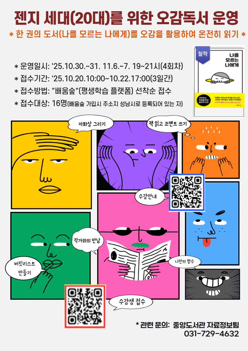 ![]() 중앙도서관 젠지 세대(20대)를 위한 오감독서 특강 참여자 모집 ○ 운영기간 : 2025. 10.30. ~ 10.31./11.6.~11.7.(4회차 운영) ○ 접수기간 : 2025. 10.20.10:00 ~ 10.22. 17:00(3일간) ○ 접수방법 : 성남시 평생학습포털 통합플랫폼 '배움숲' 온라인 선착순 접수 (https://sugang.seongnam.go.kr/) ○ 접수대상: 20대 성남시민(배움숲 가입시 주소지가 성남시로 등록되어 있는 자) ○ 접수인원: 16명(4회차 강의를 모두 참여하실 분을 모집합니다. 한 책을 온전히 읽기 위한 프로그램 입니다. 1회성 참여는 다른 분들을 위해서 자제해 주세요.) ○ 운영방법 : 대면수업 ○ 수 강 료 : 무료(도서수령 등 수업 진행 방법은 수강 확정자에게 별도 안내예정) [수강신청 유의사항] - 접수시간 이전에 홈페이지 접속하신 분들은 접수시간이 되면 반드시 새로고침F5 버튼을 누르셔야 합니다. - 과목별 모집인원 50%미만일 때는 폐강됩니다. - 강의계획서, 재료비, 개인준비물은 배움숲 홈페이지에서 확인 가능합니다. - 수강신청 시 차량번호를 입력해주셔야 무료주차권이 발급됩니다. (교육시간 + 1시간 부여, 기본 무료시간 별개) - * 주차장소가 협소(중앙도서관, 평생학습관 동시 이용)하오니 가급적 대중교통을 이용 부탁드립니다. - * 출차 전 사전정산기(도서관 1층 정문 위치)를 통해 주차할인 적용 여부를 미리 확인하세요. - 관련문의 : 중앙도서관 자료정보팀 (031-729-4632) |
