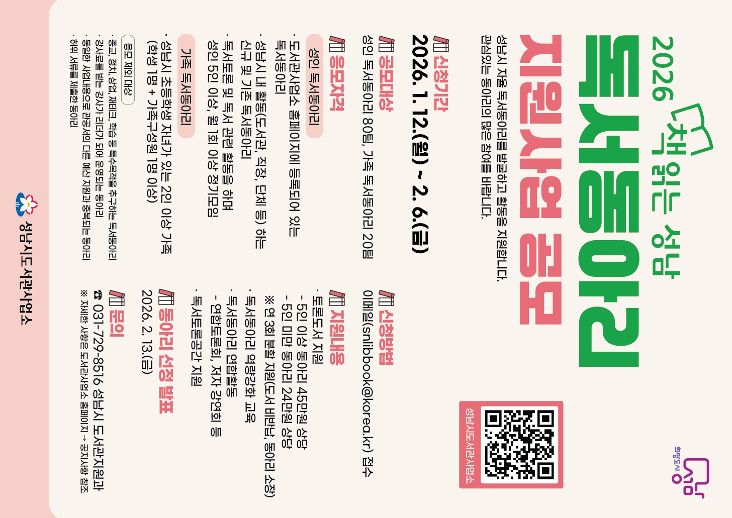 2026년 성남시 독서동아리 지원사업 참여 동아리 모집을 다음과 같이 공고합니다. 1. 사 업 명: 2026년 성남시 독서동아리 지원사업 2. 사업기간: 2026년 3월 ~ 11월 3. 공모대상: 독서동아리 100팀(성인독서동아리 80팀, 가족독서동아리 20팀) 4. 신청기간: 2026. 1. 12.(월) ~ 2. 6.(금) 24시까지 5. 신청방법: 이메일 (snlibbook@korea.kr) 접수 ※ 독서동아리 지원사업 신청서 등 제출서류 필수 제출 6. 문의문의 : 성남시 도서관지원과 031-729-8516 ※ 자세한 사항은 공고문 참고 ----------------------------------------------------------------------- FAQ 1. 성인 독서동아리와 가족 독서동아리 중복 지원 안됨. 2. 가족 독서동아리 초등입학예정도 가능. |