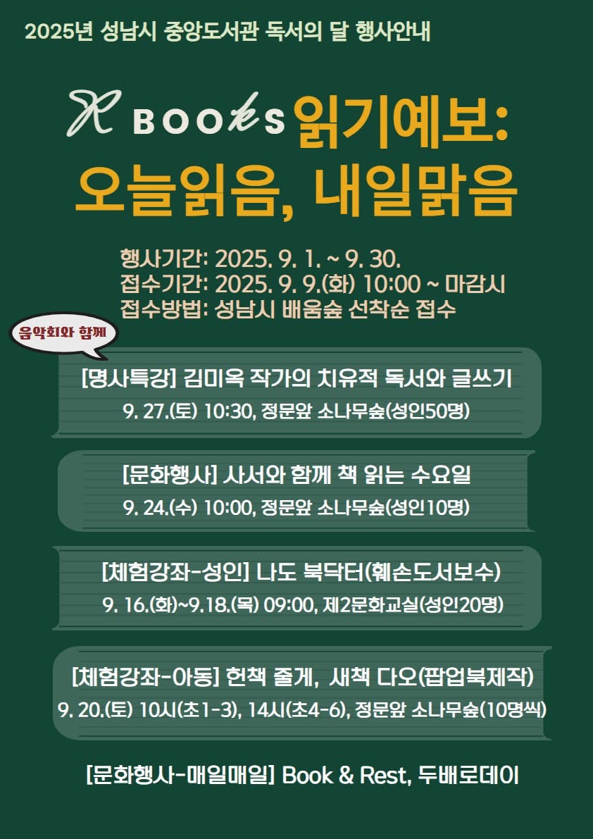 2025년 중앙도서관 9월 독서의 달 행사안내 <공식표어: "읽기예보: 오늘 읽음, 내일 맑음> 행사기간: 2025. 9. 1.(일) ~ 9. 30.(화) [한달간] 접수기간: 2025. 9. 9.(화) 10:00 ~ 마감시 행사내용: 저자특강, 문화행사, 체험강좌 등 공지사항 바로가기