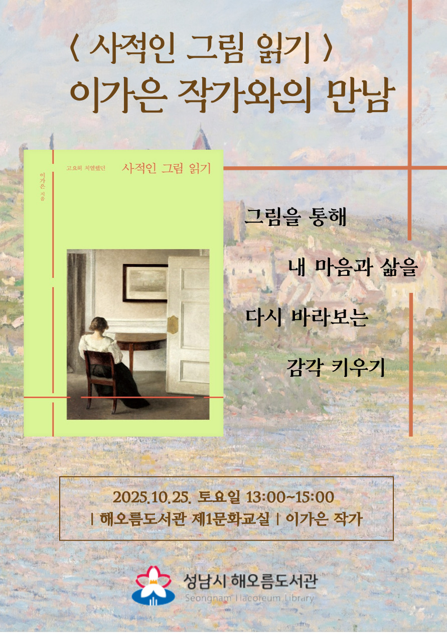 - 강의 주제 : 그림이 '보는 것'을 넘어, 자신의 생각과 감정으로 '읽는 것'임을 이해해보기 배움숲 바로가기 ☞ 평생학습간좌 수강신청 (해오름도서관 검색)