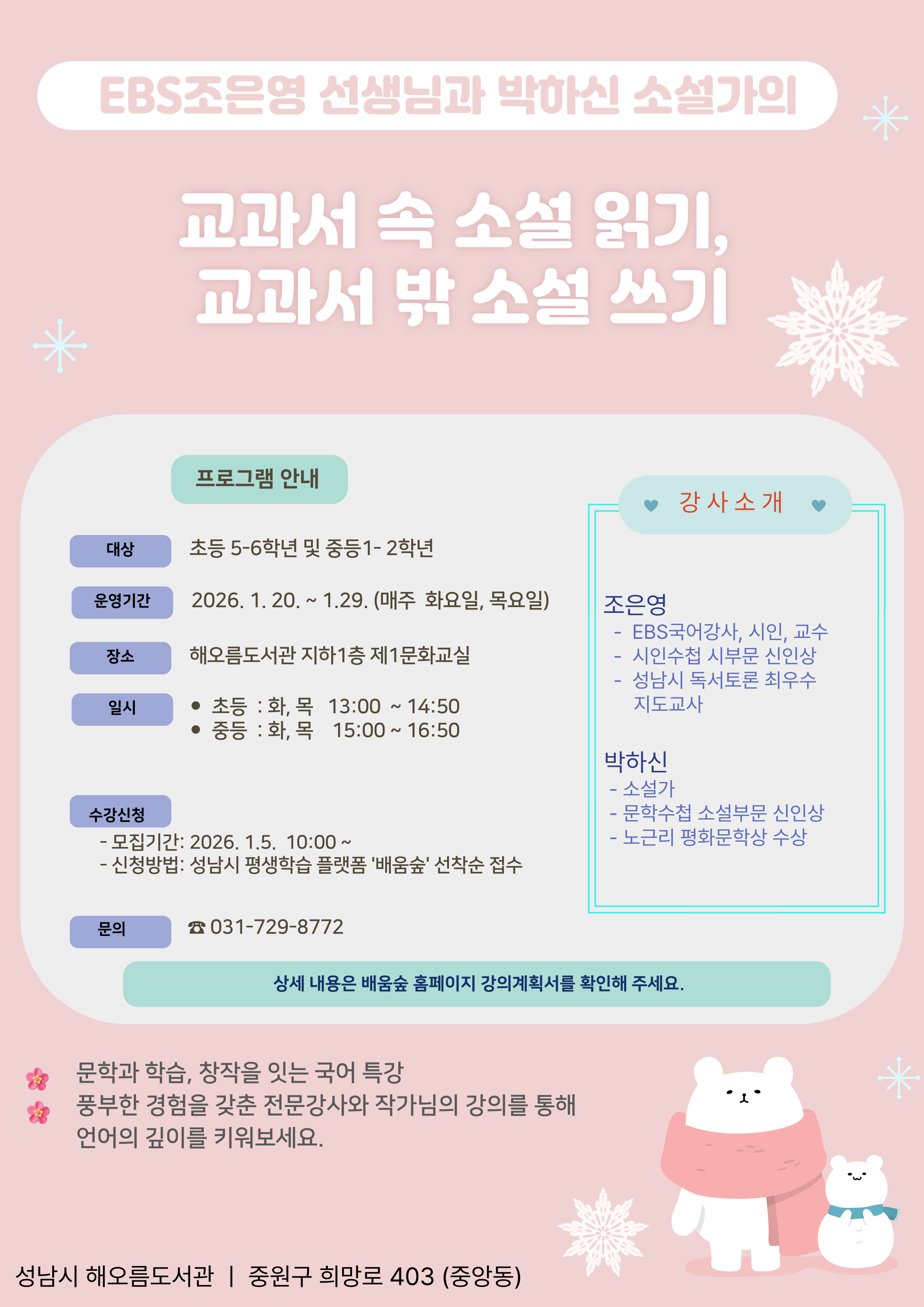 | 제목 | 2026년 해오름도서관 국어특강 『EBS 조은영 선생님과 박하신 소설가의 교과서 속 소서 읽기, 교과서 밖 소설 쓰기 』 수강생 모집 |