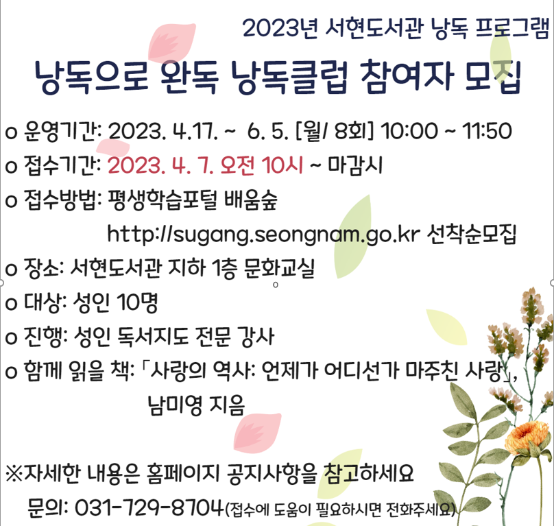 배움숲 수강신청 바로가기![]() ![]() 낭독으로 완독 낭독클럽 참여자 모집 ○ 운영기간: 2023. 4. 17.~6. 5.[월/ 8회] 10:00~11:50 ○ 접수기간: 2023. 4. 7.오전 10시부터~ 마감시 ○ 접수방법: 평생학습포털 배움숲 (http://sugang.seongnam.go.kr) 선착순 모집 ○ 대상: 성인 10명 ○ 진행: 성인 독서교육 전문 강사 ○ 함께 읽을 책: 사랑의 역사: 언젠가 어디선가 마주친 사랑/ 남미영 지음 과목별 모집인원 50% 미만일 때는 폐강 될 수 있습니다. 수강등록 후 취소 시에는 꼭 전화주셔야 하며, 대기자는 정원 마감 후 추가인원을 온라인 접수 시 연속해서 받습니다 |