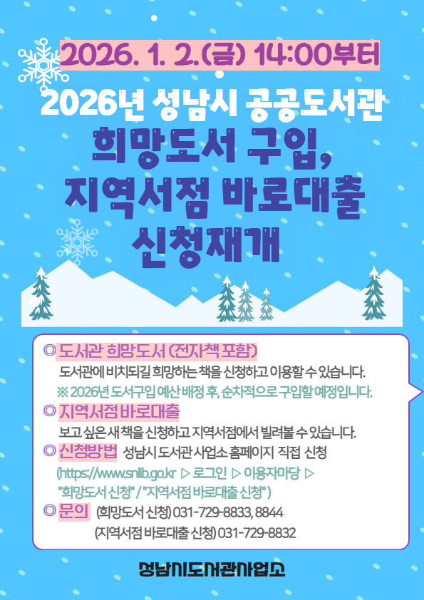 ![]() 2026년 성남시 공공도서관 희망도서 구입 및 지역서점 바로대출 신청 재개 안내 ○ 대 상 - 도서관 희망도서(전자책 포함) : 도서관에 비치되길 희망하는 책을 신청하고 대출할 수 있습니다. ※ 2026년 도서구입 예산배정 후, 순차적으로 구입할 예정입니다. - 지역서점 바로대출 : 보고 싶은 새 책을 신청하고 지역서점에서 빌려볼 수 있습니다. ※ 신청 재개일: 2026. 1. 2. (금) 14:00부터 ○ 신청방법 및 자세한 안내사항 - 성남시 도서관사업소 홈페이지(https://www.snlib.go.kr ▷ 이용자마당 ▷ "희망도서 신청" / "지역서점 바로대출 신청") ○ 문 의 - (희망도서 신청) 031-729-8833, 8844 - (지역서점 바로대출 신청) 031-729-8832 |