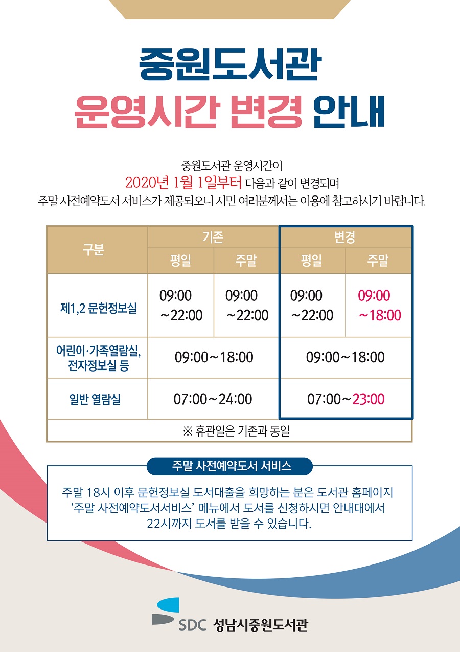 ![]() 줌뭔도서관 운영시간 변경 안내 중원도서관 운영시간이 2020년 1월 1일부터 다음과 같이 변경되며 주말사전예약도서 서비스가 제공되오니 시민 여러분께서는 이용에 참고하시기 바랍니다. 주말 18시 이후 문헌정보실 도서 대출을 희망하는 분은 도서관 홈페이지 ‘주말 사전예약도서서비스’ 메뉴에서 도서를 신청하시면 안내대에서 22시까지 도서를 받을 수 있습니다. ○ 1,2 문헌정보실 기존 변경 평일 : 09:00~22:00 평일 : 09:00~22:00 주말 : 09:00~22:00 주말 : 09:00~18:00 ○ 어린이 가족열람실, 전자정보실 등 기존 변경 평일·주말: 09:00~18:00 평일·주말: 09:00~18:00 ○ 일반 열람실 기존 변경 평일·주말: 07:00~24:00 평일·주말: 07:00~23:00 성남시중원도서관 |