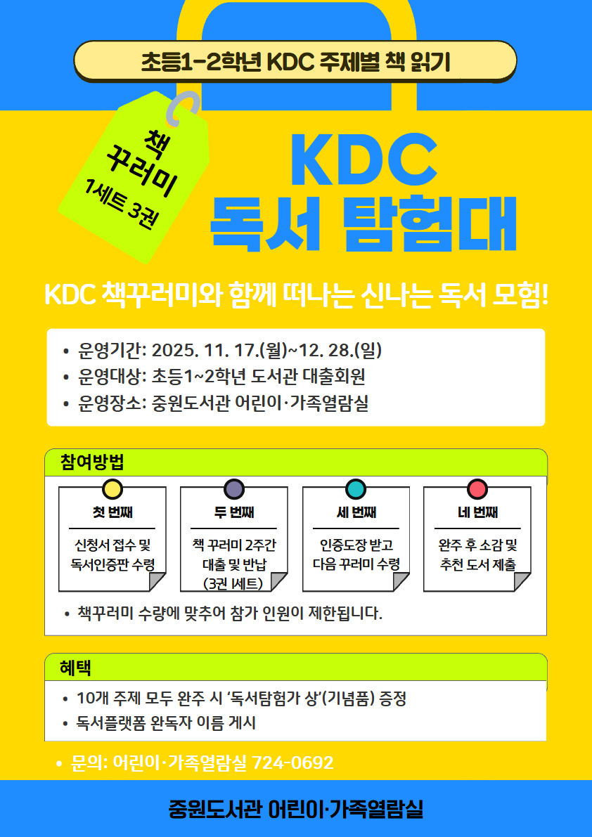 ![]() KDC(한국십진분류법) 독서 탐험대 운영 총류부터 역사까지 10개 주제의 책을 탐험하며 나만의 독서 세계를 넓혀보세요! 세 권이 담긴 책꾸러미를 펼치는 순간, 새로운 세계가 시작됩니다. ✨ □ 운영기간: 2025. 11. 17.(월)~12. 28.(일) □ 운영대상: 초등학교 1~2학년 도서관 대출회원 □ 운영장소: 중원도서관 어린이·가족열람실 □ 운영내용 ❍ 책 꾸러미 운영 방법 ▶ (1단계) 참가신청서 접수 및 독서인증판 수령 ▶ (2단계) 책 꾸러미 2주간 대출 및 반납 ▶ (3단계) 사서에게 인증도장을 받고 다음 꾸러미 수령 ▶ (4단계) 모든 주제 완주 후 소감문 및 추천도서 제출 ❍ 10개 주제 완주 시 ▶ ‘독서탐험가 상’ (소정의 기념품) 증정, 독서플랫폼에 완독자 이름 게시 * 책꾸러미는 중원도서관 어린이가족열람실에서만 대출과 반납 가능합니다.(상호대차 불가, 반납연기 불가) |