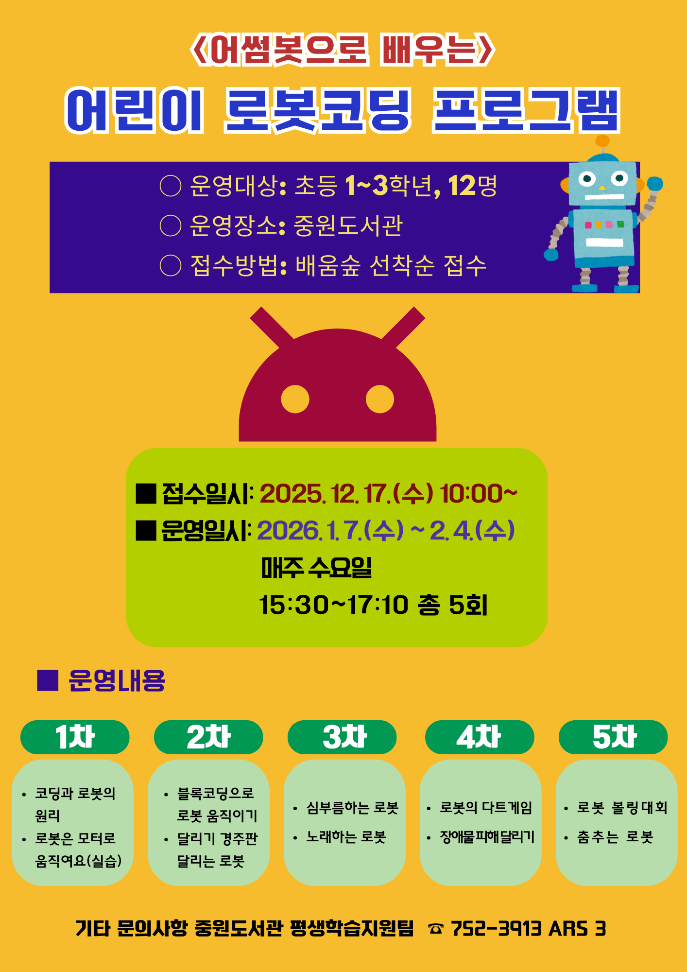 ![]() <어썸봇으로 배우는> 어린이 로봇코딩 프로그램 ○ 운영대상: 초등 1~3학년, 12명 ○ 운영장소: 중원도서관 ○ 접수방법: 배움숲 선착순 접수 -> 바로가기 ■ 접수일시: 2025. 12. 17.(수) 10:00~ ■ 운영일시: 2026. 1. 7.(수) ~ 2. 4.(수) 매주 수요일 15:30~17:10 총 5회 ■ 운영내용 1차 코딩과 로봇의 원리, 로봇은 모터로 움직여요(실습) 2차 블록코딩으로 로봇 움직이기, 달리기 경주판 달리는 로봇 3차 심부름하는 로봇 노래하는 로봇 4차 로봇의 다트게임, 장애물 피해 달리기 5차 로봇 볼링대회, 춤추는 로봇 |