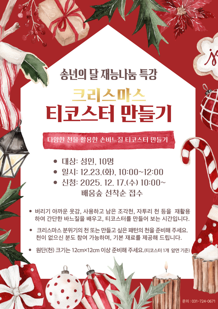 ![]() 【2025년 송년의 달 재능나눔 특강 안내】 **접수기간: 2025. 12. 17.(수) 10:00~ 배움숲 선척순** ※ 배움숲 접수창으로 ☞ < 성남시 평생학습 통합플랫폼 - 배움숲 (seongnam.go.kr)> <크리스마스 티코스터 만들기> - 대상: 성인, 10명 - 일시: 2025. 12. 23.(화), 10:00~12:00 - 내용: 다양한 천을 활용한 손바느질 티코스터 만들기 * 버리기 아까운 옷감, 사용하고 남은 조각천, 자투리 천 등을 재활용하여 간단한 바느질을 배우고, 티코스터를 만들어 보는 시간입니다. * 크리스마스 분위기의 천 또는 만들고 싶은 패턴의 천을 준비해 주세요. 천이 없으신 분도 참여 가능하며, 기본 재료를 제공해 드립니다. * 원단(천) 크기는 12cm×12cm 이상 준비해 주세요.(티코스너 1개 앞면 기준) * 문의) 031-724-0671 |