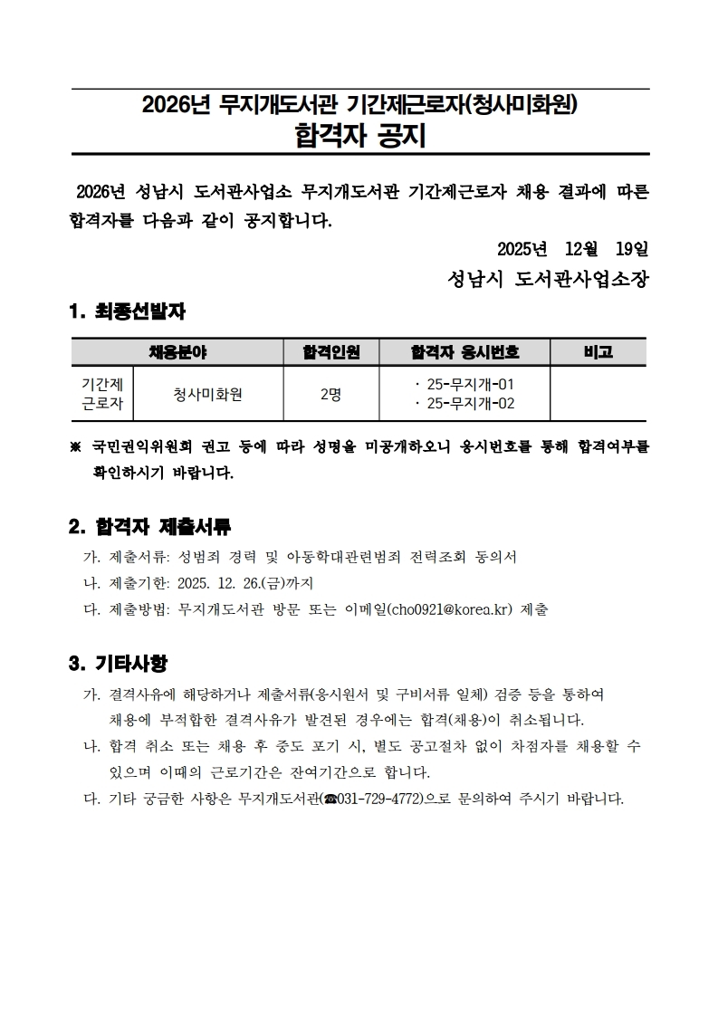 2026년 무지개도서관 기간제근로자(청사미화원) 합격자 공지