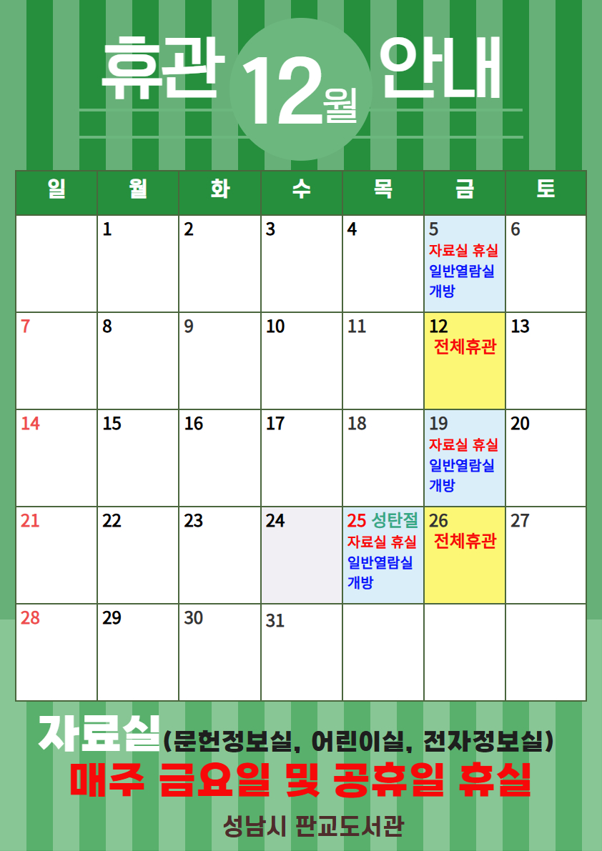 ▣ 판교도서관 2025년 12월 휴관안내 ▣