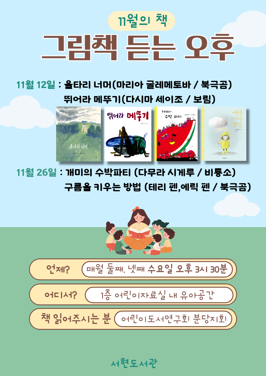 11월 12일(수): 울타리 너머 (마리아 굴레메토바/ 북극곰), 뛰어라 메뚜기 (다시마 세이조/ 보림) 11월 26일(수): 개미의 수박파티 (다무라 시게루/ 비룡소), 구름을 키우는 방법 (테리 펜, 에릭 펜/ 북극곰) ○ 언제? 매월 두번째, 네번째 수요일 15시 30분(방학기간 1~2월, 7~8월 제외) ○ 어디서? 1층 어린이자료실 내 유아공간 ○ 책 읽어주는 분: 어린이도서연구회 분당지회 회원 ** 그림책은 사정에 의해 변경 될 수 있습니다** ※ 전체 그림책 목록은 홈페이지 > 문화마당 > 문화행사 > 그림책 듣는 오후에서 확인할 수 있습니다. 바로가기 링크 → 그림책 듣는 오후: 서현도서관(snlib.go.kr) |