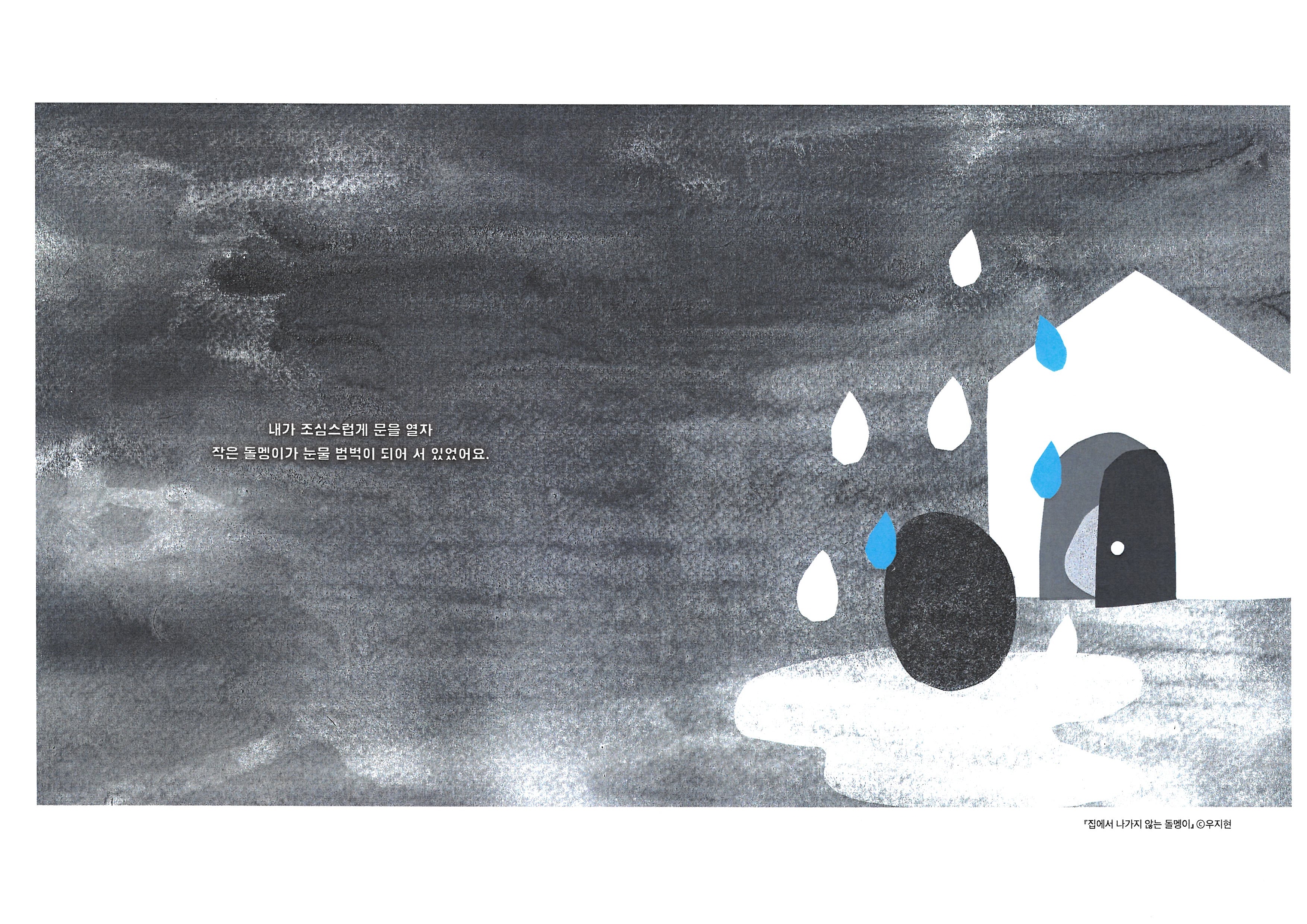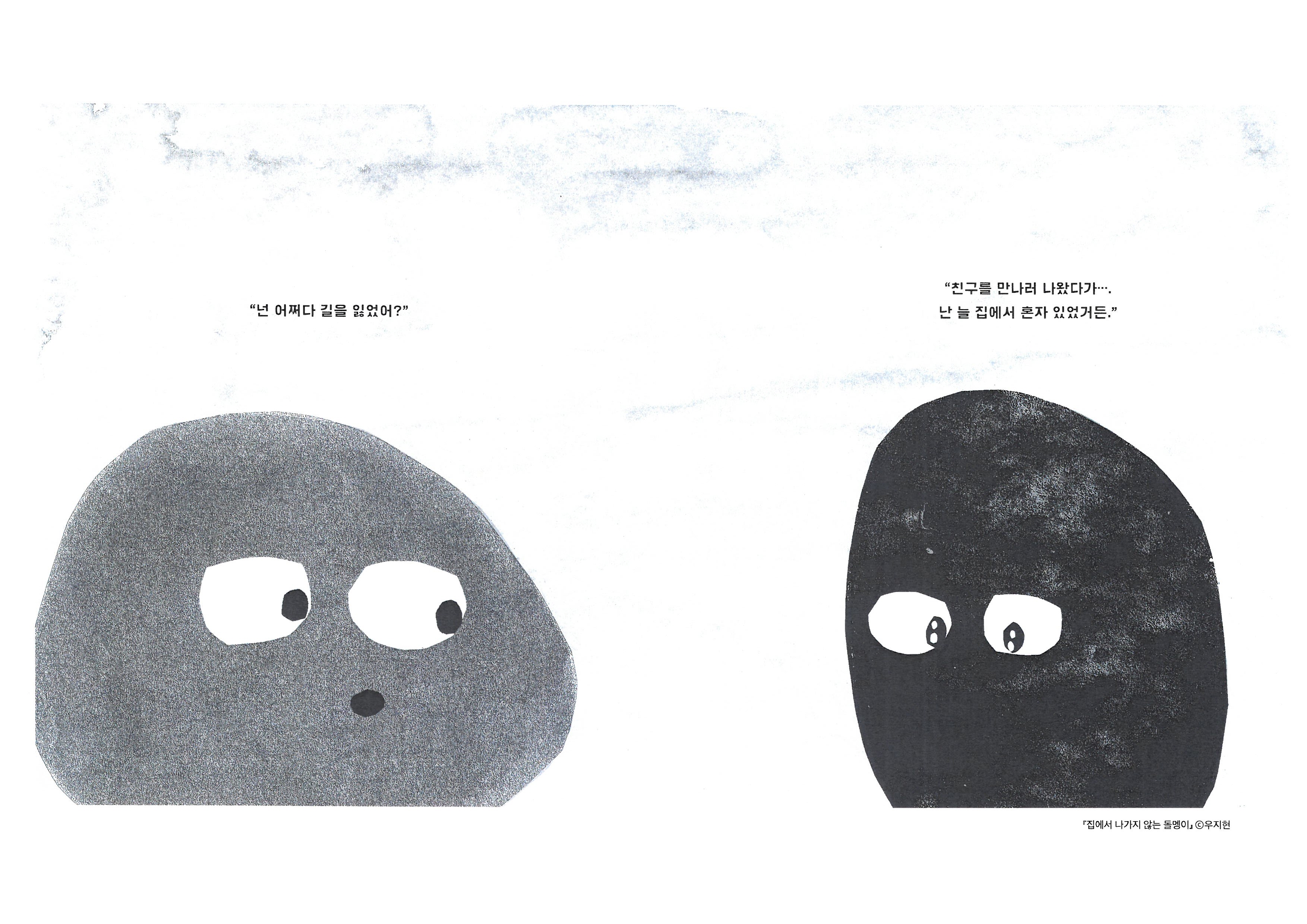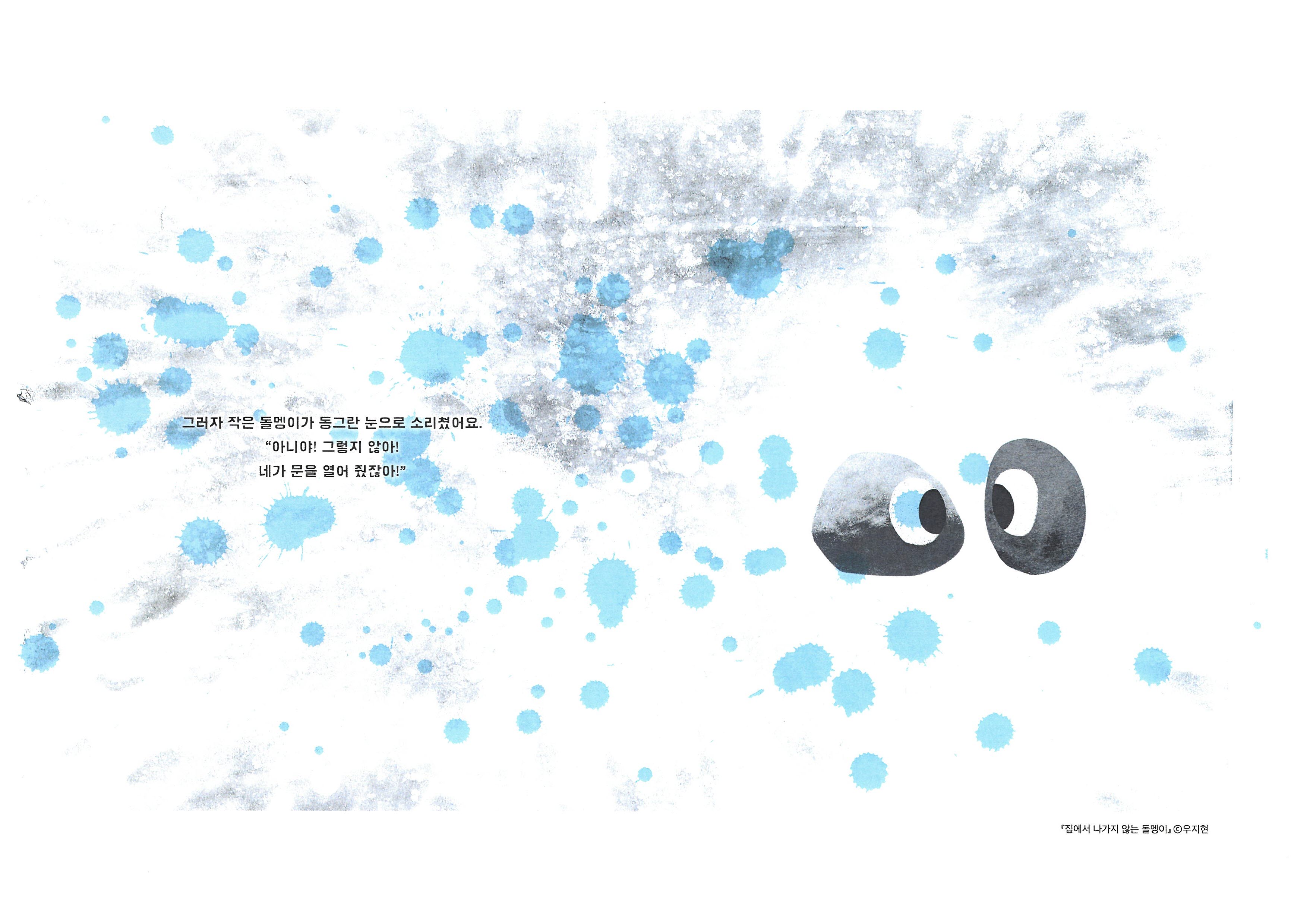 『집에서 나가지 않는 돌멩이』에는 겁이 많아 집 안에 숨어 지내는 돌멩이가 등장합니다. 바깥의 작은 소리에도 화들짝 놀라 눈물을 흘리는 돌멩이에게 어느 날, 방문객으로 작은 돌멩이가 찾아옵니다. 혼자였던 작은 돌멩이가 친구를 찾아 용기를 내 나왔는데 바깥에서 길을 잃었다는 말에 주인 돌멩이는 여전히 세상이 두렵다고 편견을 굳히려 하지만, 작은 돌멩이는 주인공이 문을 열어 준 것이 바로 큰 용기라고 말해 줍니다. 금세 친구가 된 둘에게 또 다른 위협이 다가오는데…. 과연 이 두 돌멩이는 어떤 결정을 내릴까요?(출처:교보문고)
