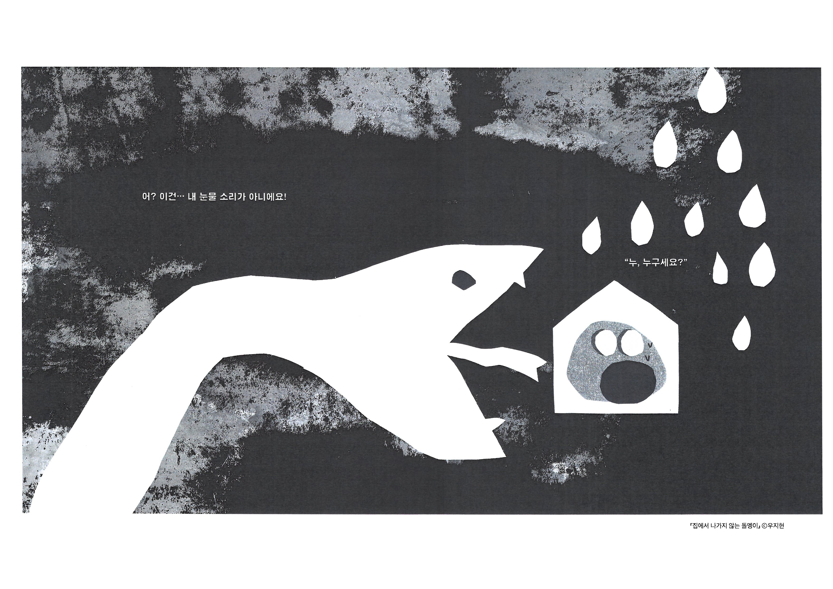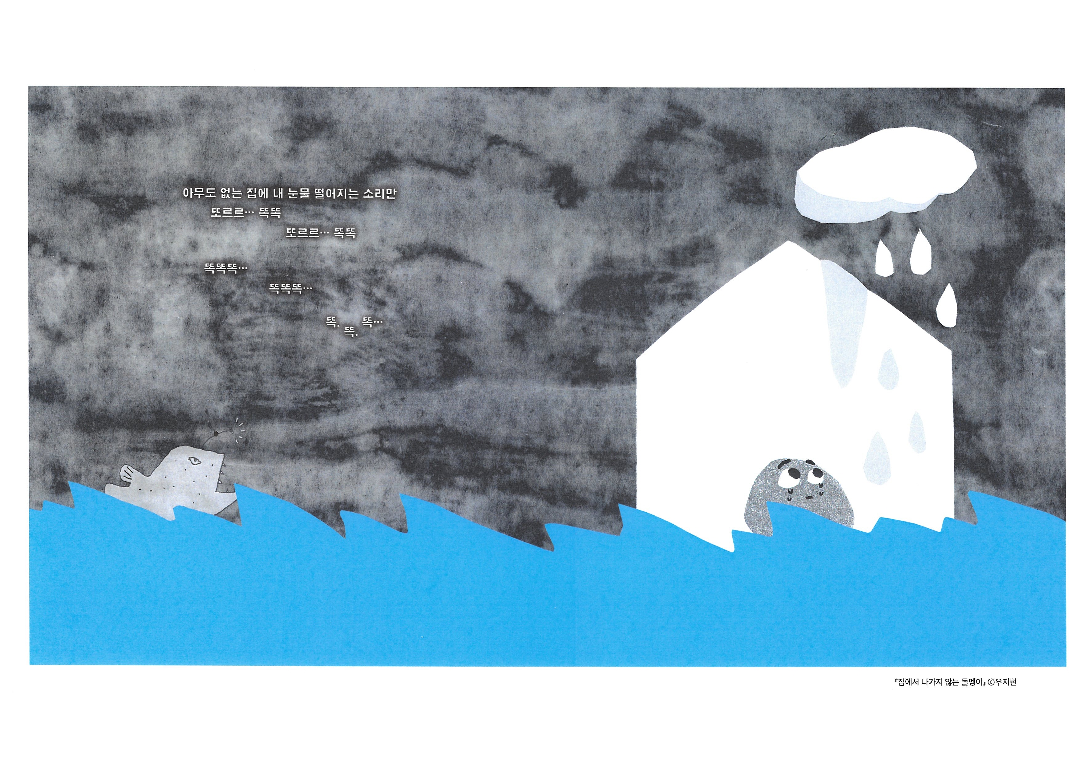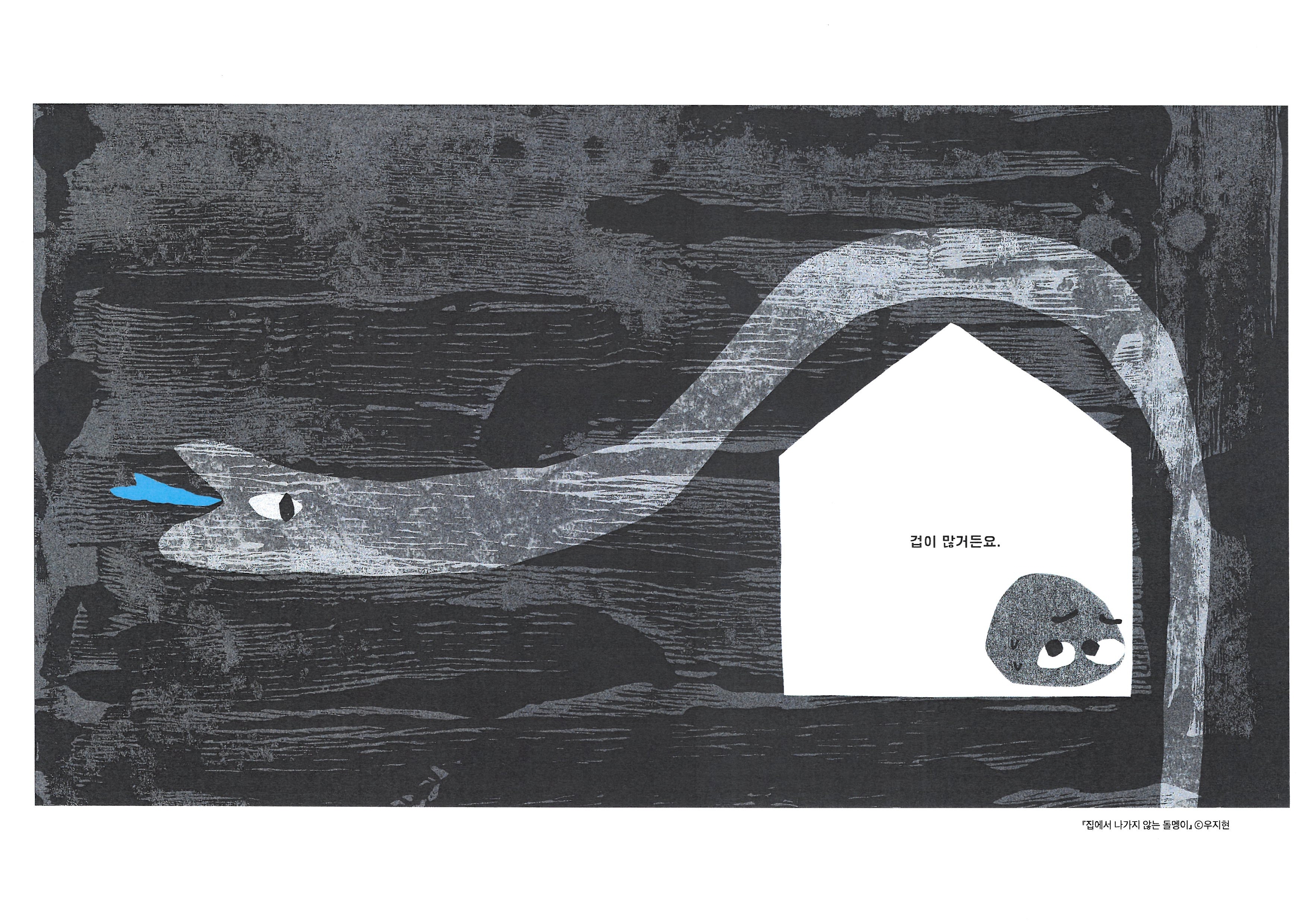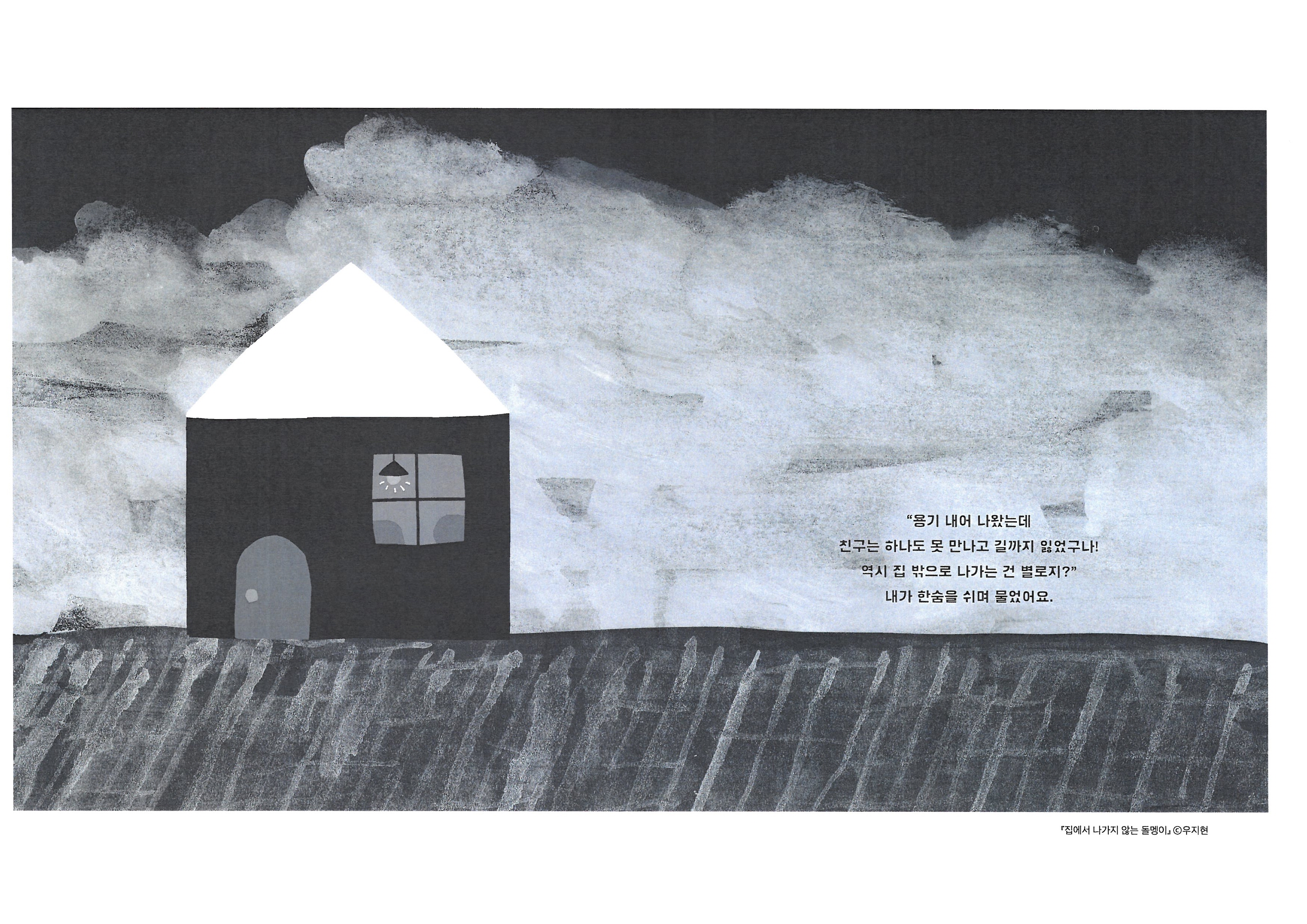 『집에서 나가지 않는 돌멩이』에는 겁이 많아 집 안에 숨어 지내는 돌멩이가 등장합니다. 바깥의 작은 소리에도 화들짝 놀라 눈물을 흘리는 돌멩이에게 어느 날, 방문객으로 작은 돌멩이가 찾아옵니다. 혼자였던 작은 돌멩이가 친구를 찾아 용기를 내 나왔는데 바깥에서 길을 잃었다는 말에 주인 돌멩이는 여전히 세상이 두렵다고 편견을 굳히려 하지만, 작은 돌멩이는 주인공이 문을 열어 준 것이 바로 큰 용기라고 말해 줍니다. 금세 친구가 된 둘에게 또 다른 위협이 다가오는데…. 과연 이 두 돌멩이는 어떤 결정을 내릴까요?(출처:교보문고)
