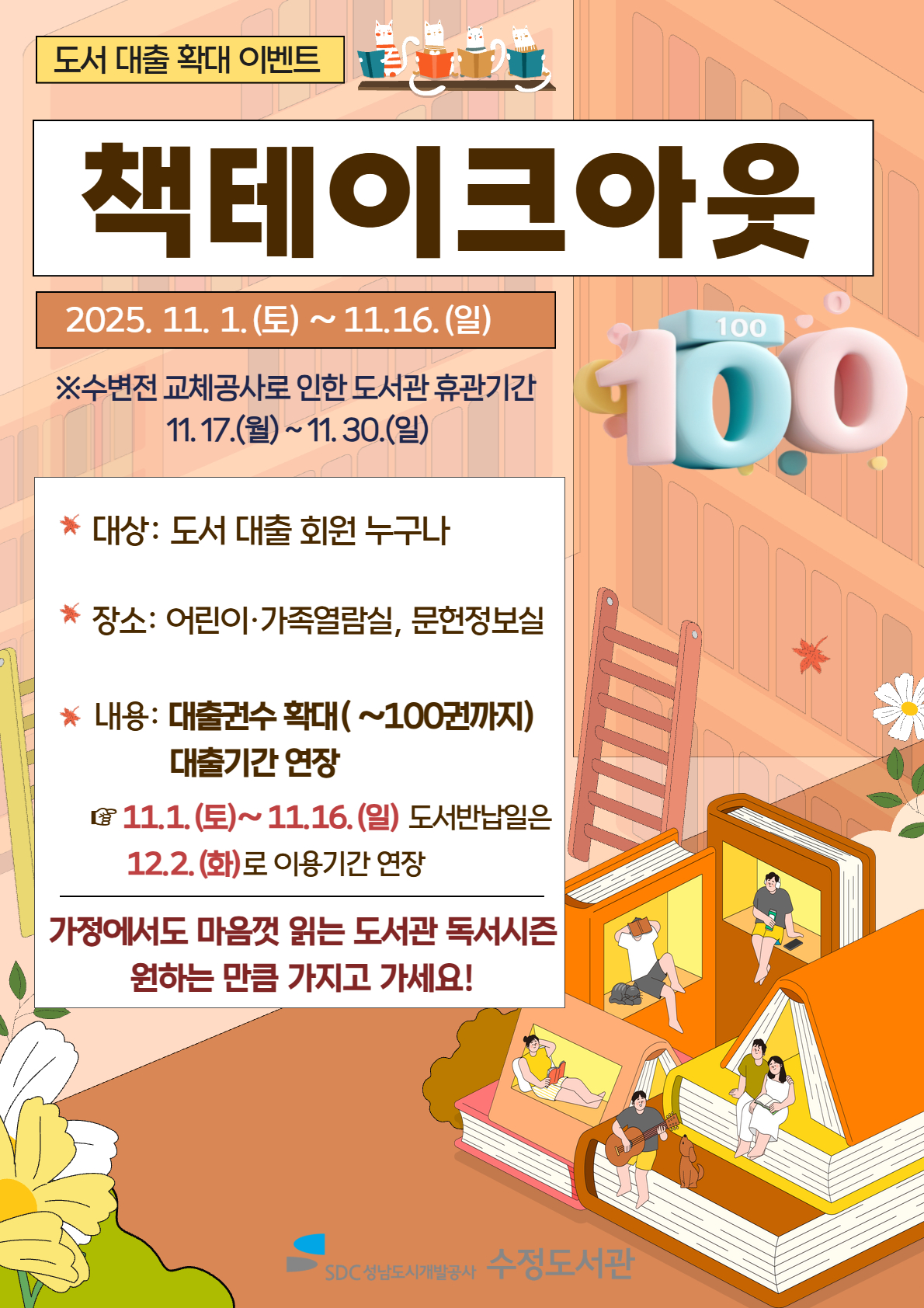 ![]() <책테이크아웃> 운영 안내 - 대상: 도서 대출 회원 누구나 - 장소: 어린이가족열람실, 문헌정보실 - 내용: 도서 대출 확대 이벤트로 가정에서 마음껏 읽는 도서관 독서시즌 운영 대출권수 확대 (~100권까지) / 대출기간 연장 ※ 11.1.(토)~11.13.(일) 도서반납예정일은 12.2.(화)로 이용기간 연장 ※ 수변전 교체공사로 인한 도서관 휴관기간: 11.17.(월)~ 11.30.(일) |