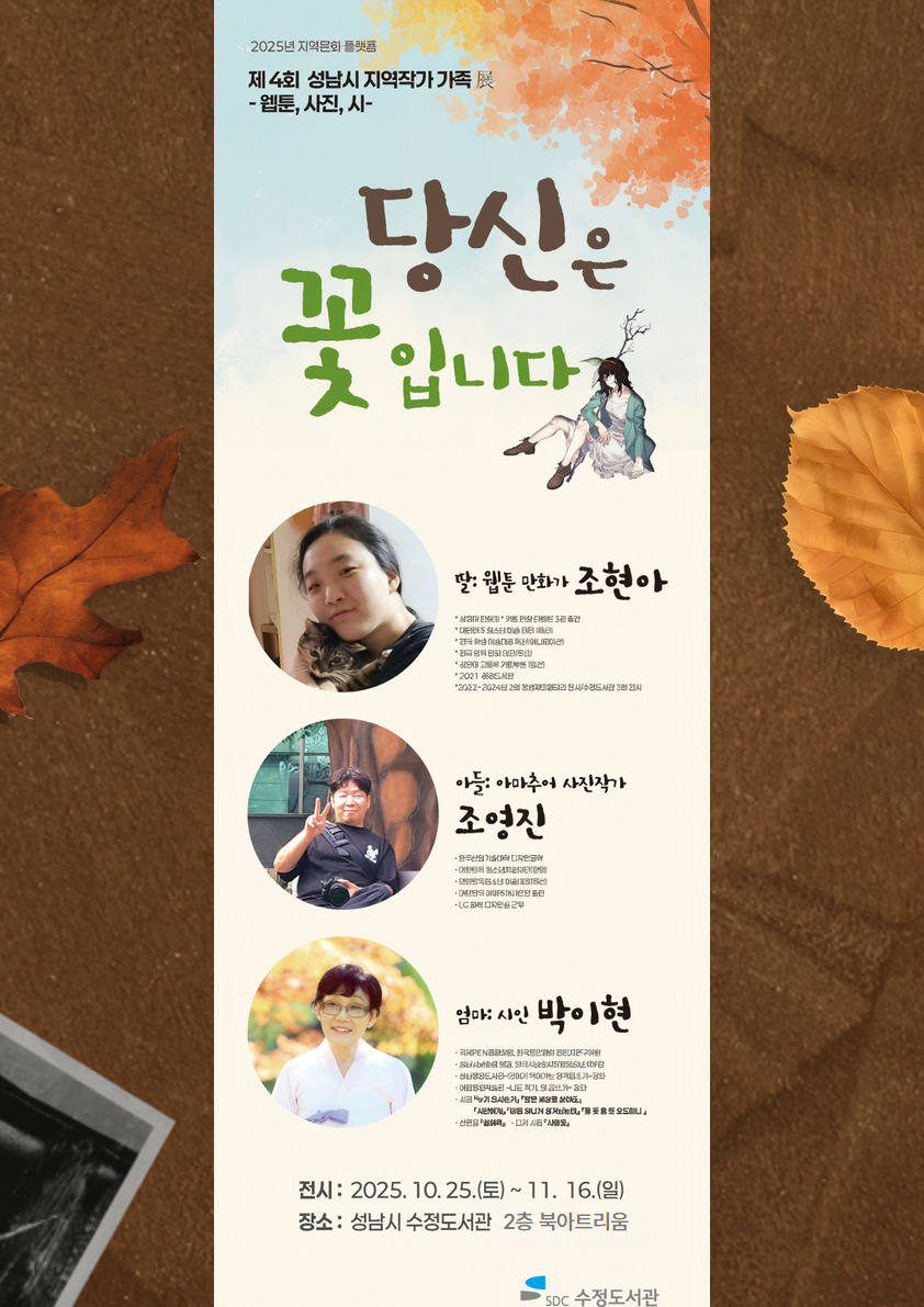 - 전시내용: 박이현_시인(엄마), 조영진_아마추어 사진작가(아들), 조현아_웹툰 만화가(딸)의 가족 작품 전시입니다.