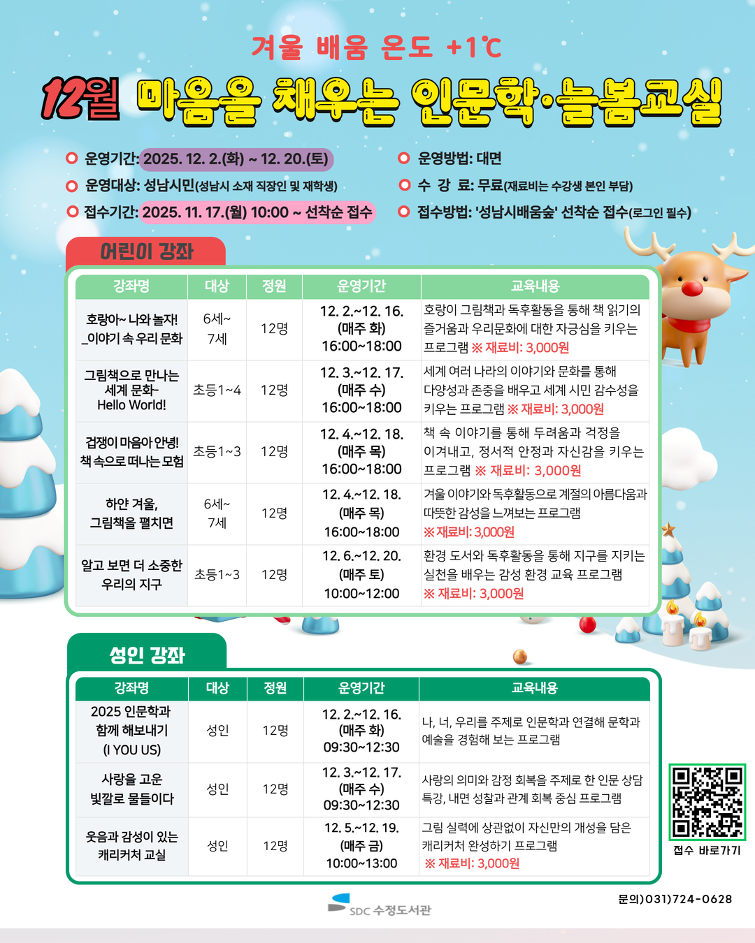 □ (겨울 배움 온도 +1°C) 12월 마음을 채우는 인문학·놀이교실 ○ 운영기간: 2025. 12. 2.(화) ~ 12. 20.(토) ○ 접수기간: 2025. 11. 17.(월) 10:00 ~ 선착순 접수 ○ 운영대상: 성남시민(성남시 소재 직장인 및 재학생) ○ 운영방법: 대면수업 ○ 수강생 모집 - 접수기간: 2025. 11. 17.(월) 10:00 ~ 선착순 접수 - 접수방법: 성남시 배움숲 홈페이지 접수 ○ 접수바로가기 ------> 클릭 - (성인) 마음을 채우는 인문학 ⦁1. 2025 인문학과 함께 해보내기(I YOU US) ▶ 12. 2.~12. 16.(화) / 09:30~12:30 ⦁2. 사랑을 고운 빛깔로 물들이다 ▶ 12. 3.~12. 17.(수) / 09:30~12:30 ⦁3. 웃음과 감성이 있는 캐리커처 교실 ▶ 12. 5.~12. 19.(금) / 10:00~13:00 ※ 재료비 3,000원 - (어린이) 마음을 채우는 늘봄교실 ⦁1. 호랑아~ 나와 놀자!_이야기 속 우리 문화 ▶ 12. 2.~12. 16.(화) / 16:00~18:00 ※ 재료비 3,000원 ⦁2. 그림책으로 만나는 세계 문화-Hello World! ▶ 12. 3.~12. 17.(수) / 16:00~18:00 ※ 재료비 3,000원 ⦁3. 겁쟁이 마음아 안녕! 책 속으로 떠나는 모험 ▶ 12. 4.~12. 18.(목) / 16:00~18:00 ※ 재료비 3,000원 ⦁4. 하얀 겨울, 그림책을 펼치면 ▶ 12. 4.~12. 18.(목) / 16:00~18:00 ※ 재료비 3,000원 ⦁5. 알고 보면 더 소중한 우리의 지구 ▶ 12. 6.~12. 20.(토) / 10:00~12:00 ※ 재료비 3,000원 ○ 수정도서관에서는 노후 수변전설비 교체 공사로 인해 2025년 11월 17일(월) ~ 11월 30일(일) (총 2주간) 기간 동안 임시휴관합니다. - 임시휴관 기간 중 평생교육 및 강좌 문의 카카오톡 오픈채팅방을 통해 진행됩니다. ▶ 평생교육 오픈채팅방 바로가기 |