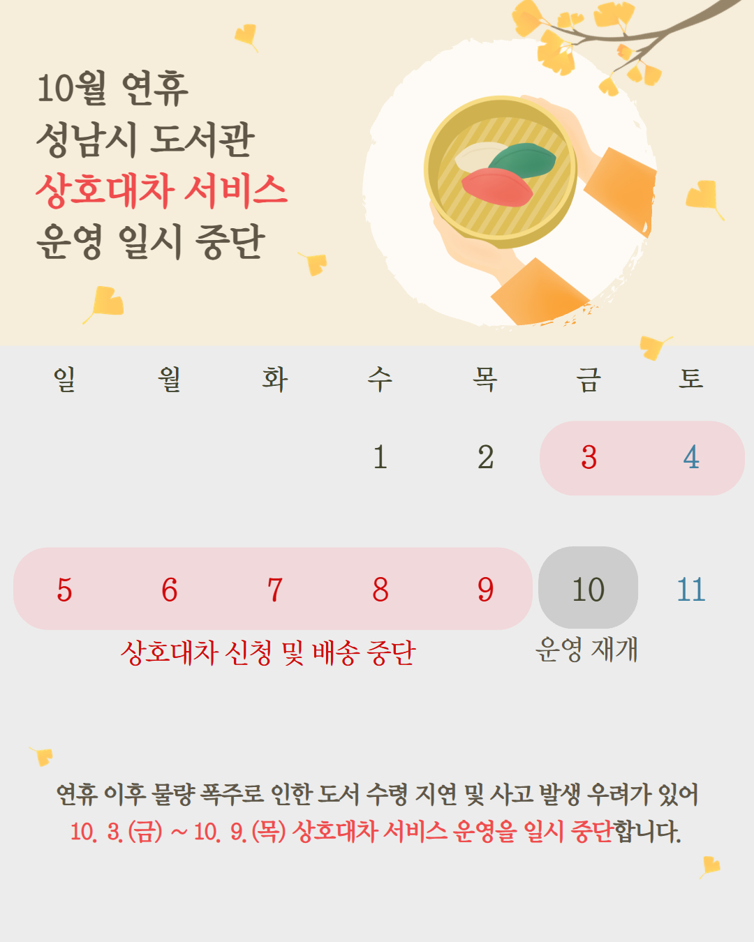 연휴 이후 물량 폭주로 인한 도서 수령 지연 및 사고 발생 우려가 있어 위 기간 동안 상호대차 서비스 운영을 일시 중단합니다. 모두 즐거운 연휴 보내시고, 따뜻한 한가위 되세요!