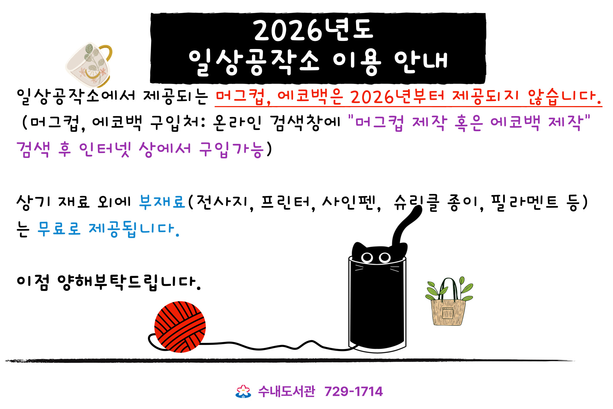 - 2026년도 수내도서관 일상공작소 이용 안내 -일상공작소에서 제공되는 머그컵, 에코백은 내년(2026년)부터 제공되지 않습니다. (에코백/ 머그컵 구입처: 온라인 검색창에 "머그컵 제작 또는 에코백 제작"검색 후 인터넷상에서 구입 가능) 상기 재료외에 부재료(전사지, 프린터, 사인펜, 슈링클 종이, 필라멘트 등)는 무료로 제공됩니다. 이점 양해부탁드립니다. 문의: 729-1714 |